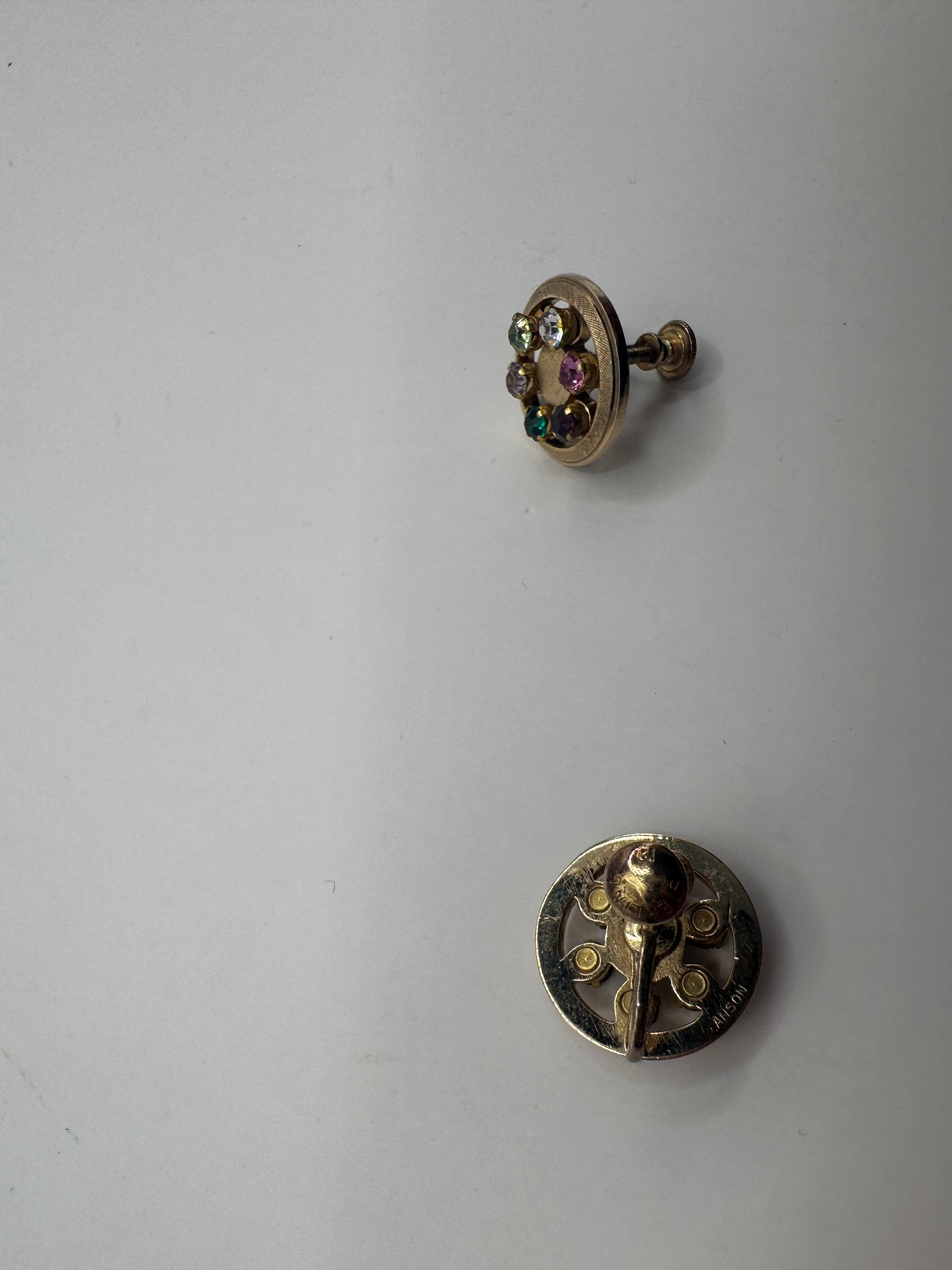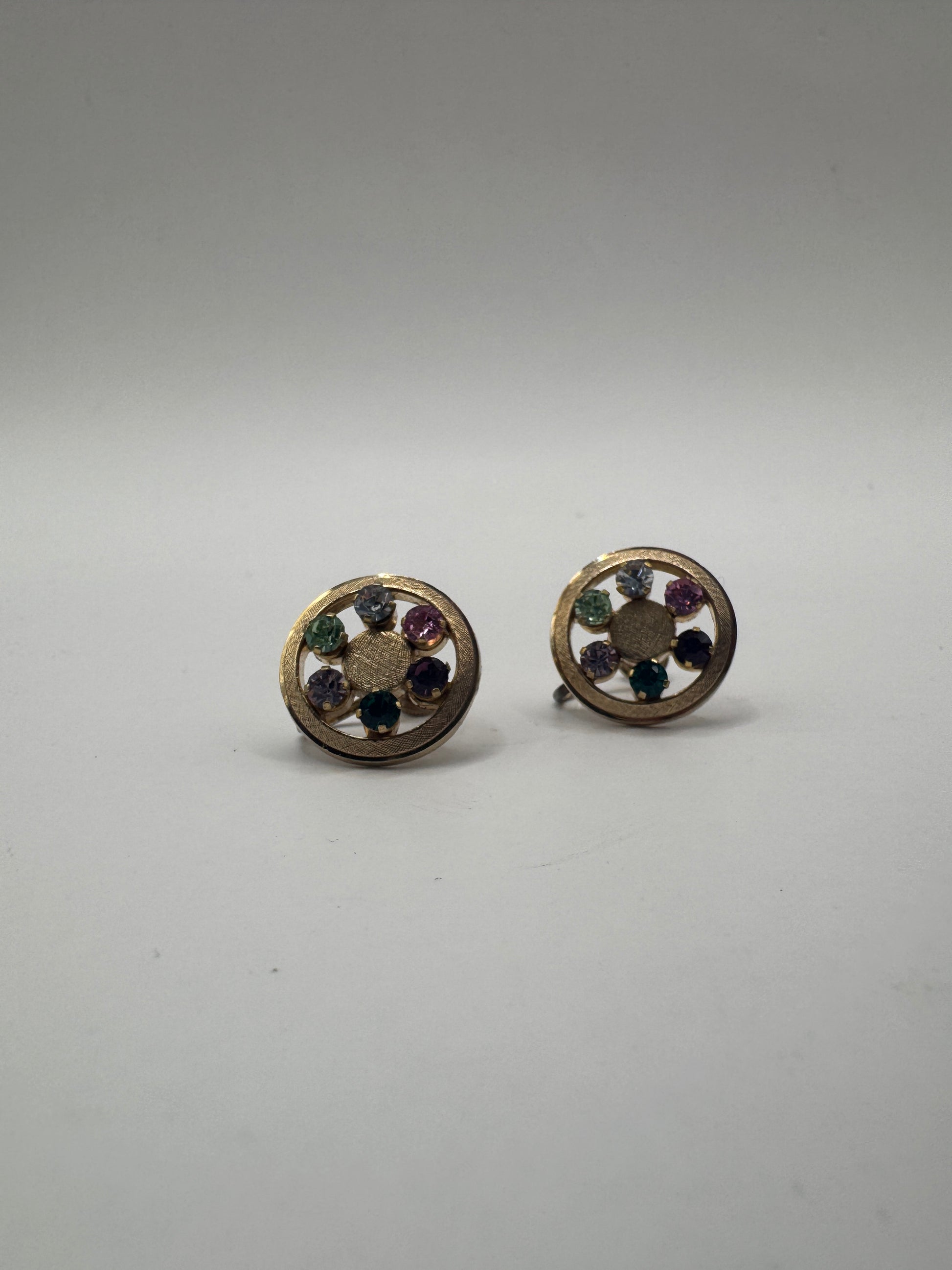 These 1950s Anson rainbow crystal clips earrings bring classic mid-century charm to your jewelry box. The round gold-plated sterling silver settings feature a circle of multicolor crystals, creating a playful “rainbow” sparkle that’s easy to dress up or down.