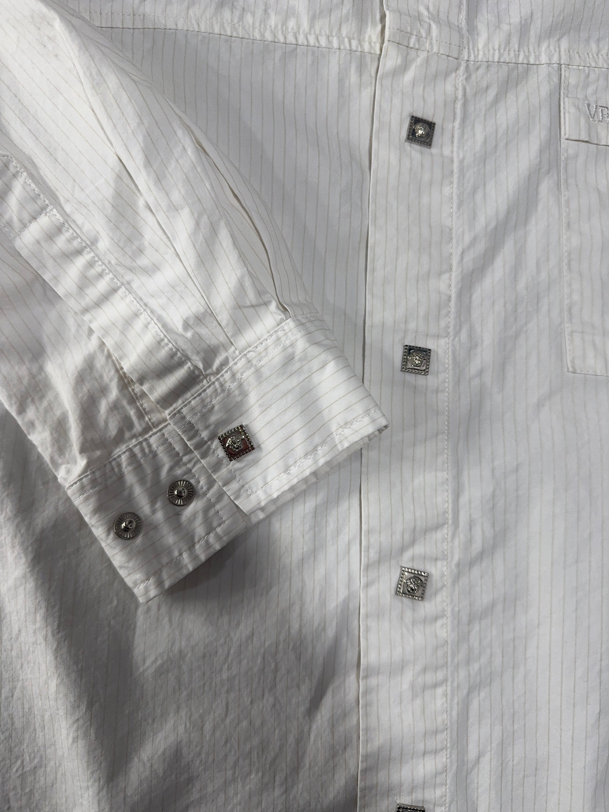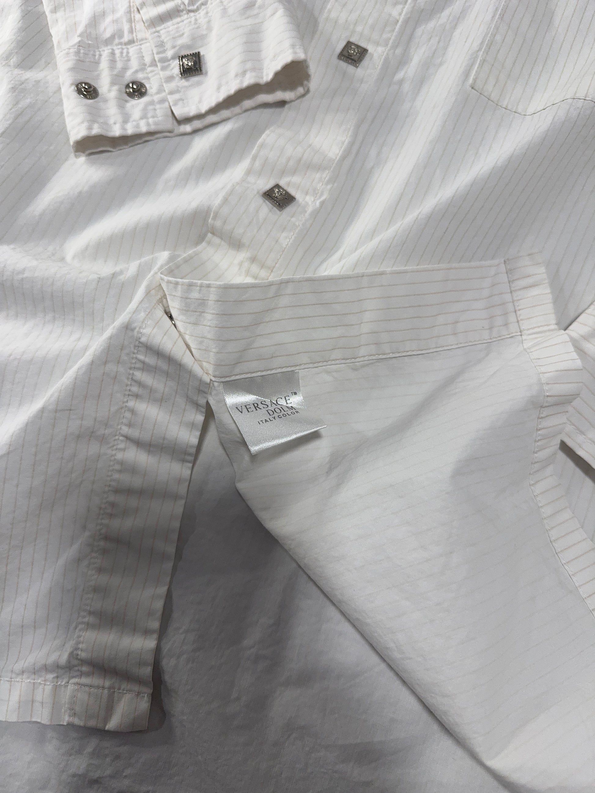 Elevate your style with this Versace Dolm men’s shirt, featuring a crisp white fabric with subtle pinstripes and signature Versace square logo buttons. This long-sleeve shirt is tailored for a modern fit and showcases designer details throughout, including a chest pocket and branded hardware. Size XL with measurements: length 29”, width 23”, sleeve 24”. Perfect for business, special occasions, or adding a touch of Italian luxury to your everyday look.