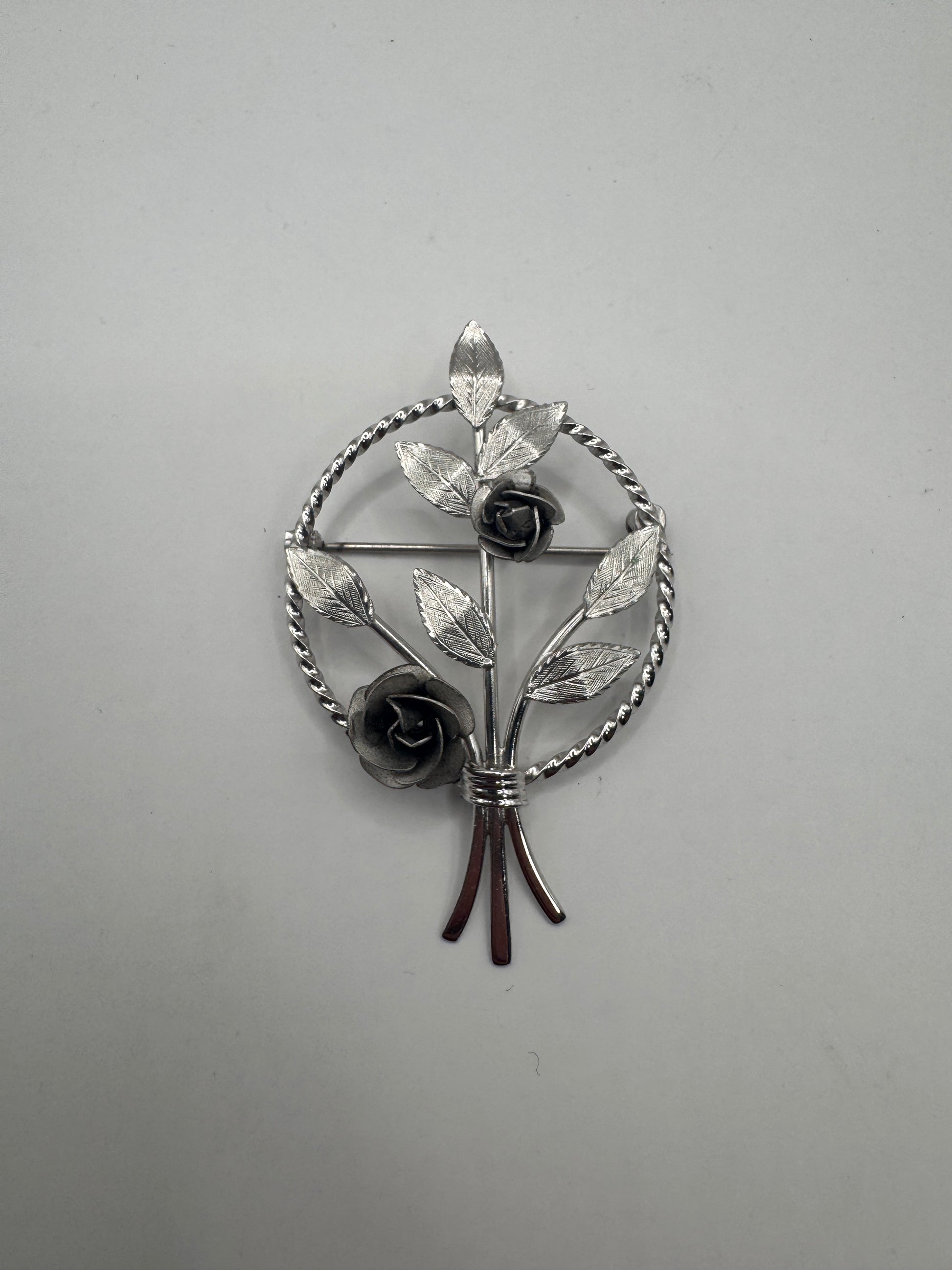 This fine sterling silver BOND BOYD circular pin brooch is a beautiful vintage piece with timeless elegance. The design features a round twisted frame filled with detailed leaves and sculpted roses, creating a delicate floral bouquet effect.