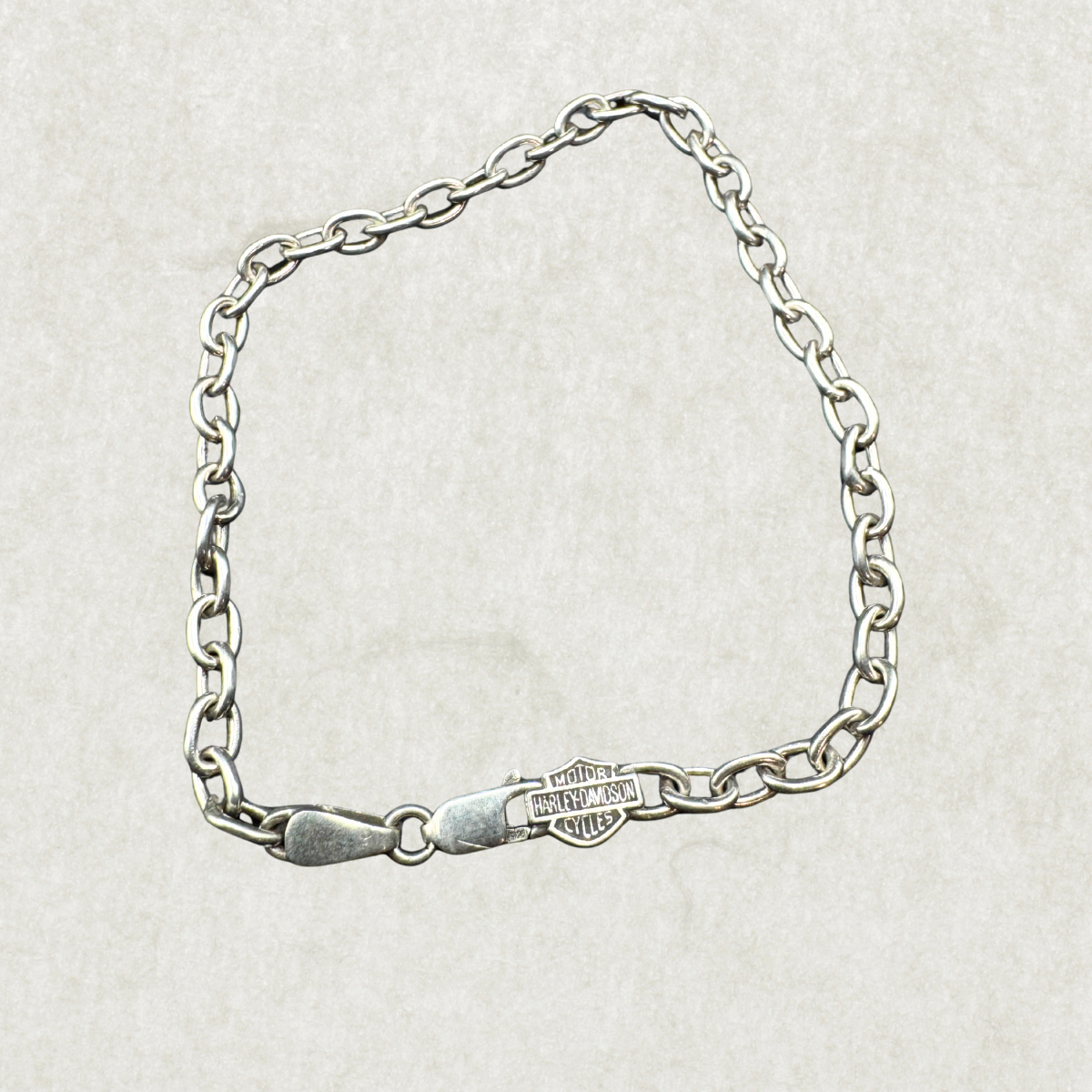 Show your love for classic style and legendary motorcycles with this authentic Harley Davidson sterling silver bracelet. Measuring approximately 8 inches, this sturdy chain bracelet features the iconic Harley Davidson logo on the clasp, making it a standout accessory for any enthusiast. Crafted from genuine sterling silver, it’s a durable and timeless piece—perfect for everyday wear or gifting.