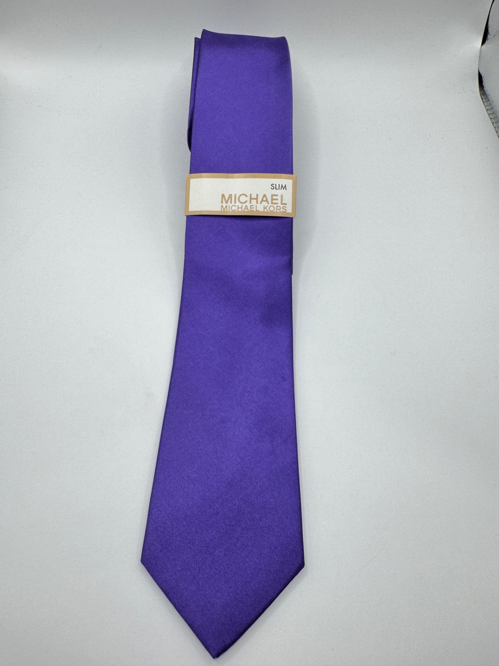 Upgrade your wardrobe with this brand new Michael Kors tie, crafted from luxurious 100% silk. Featuring a sleek slim design in a vibrant solid purple, this tie measures 58 inches in length and 3 inches at its widest point. The premium silk fabric ensures a smooth drape and sophisticated finish, perfect for modern business attire, formal occasions, or anyone seeking a pop of color with timeless appeal.