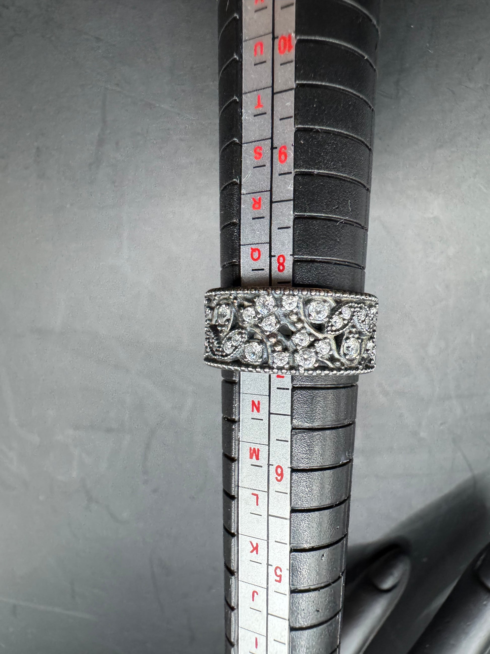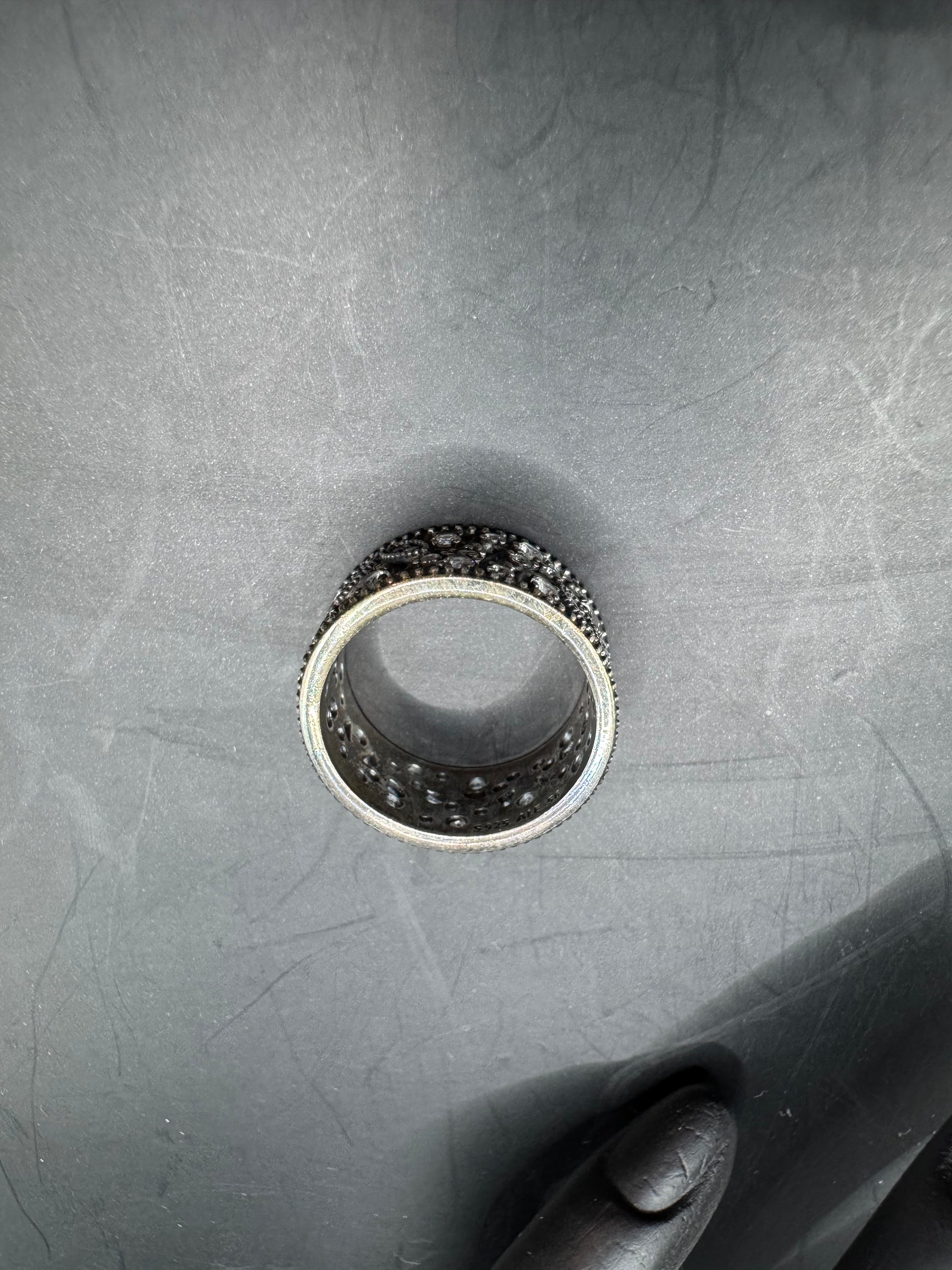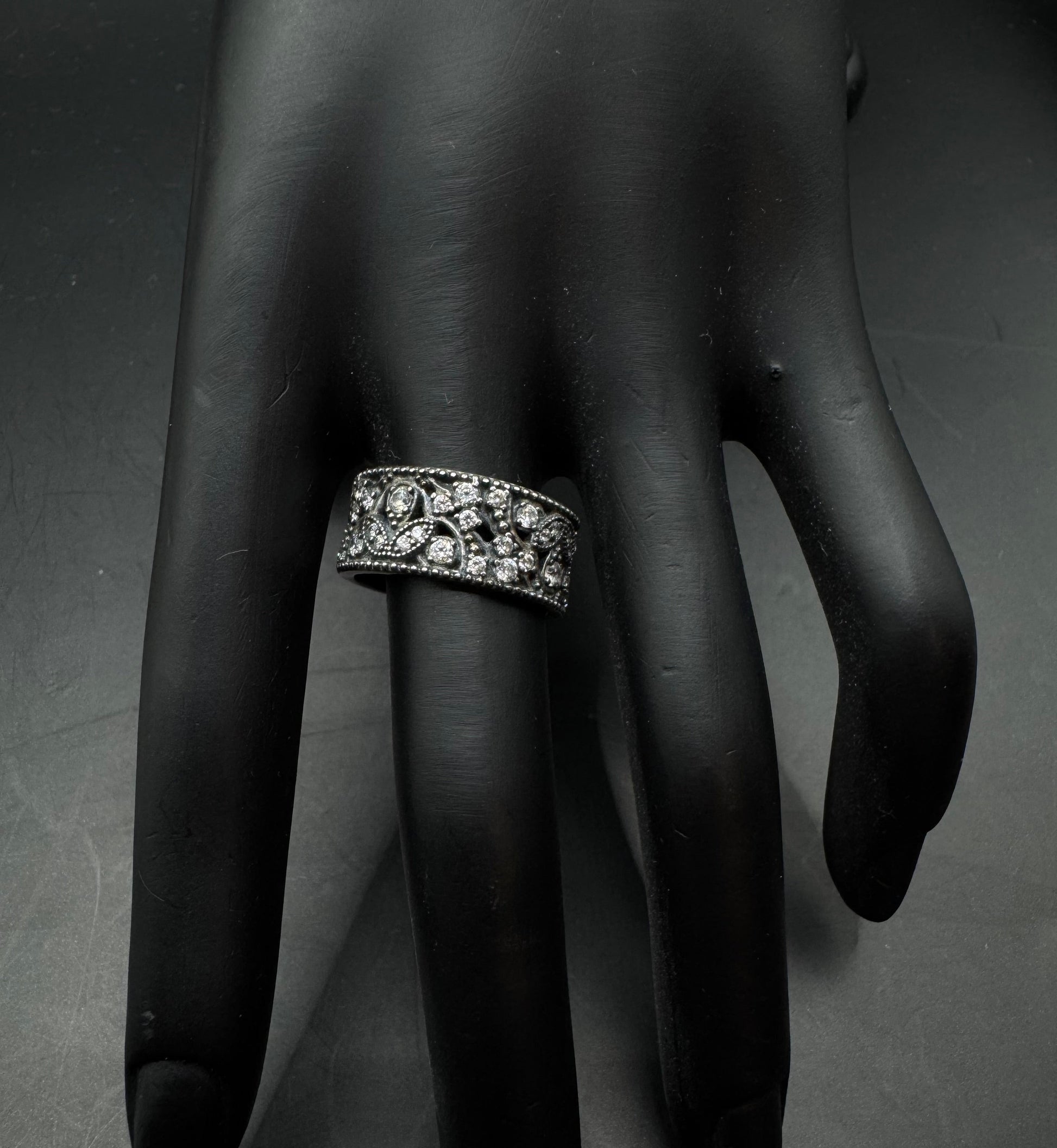 This authentic Pandora 925 sterling silver band ring adds subtle sparkle with a vintage-inspired feel. The wide band features raised beadwork, tiny paisley-style swirls and clear CZ stones scattered throughout, creating a textured, antique-look finish.