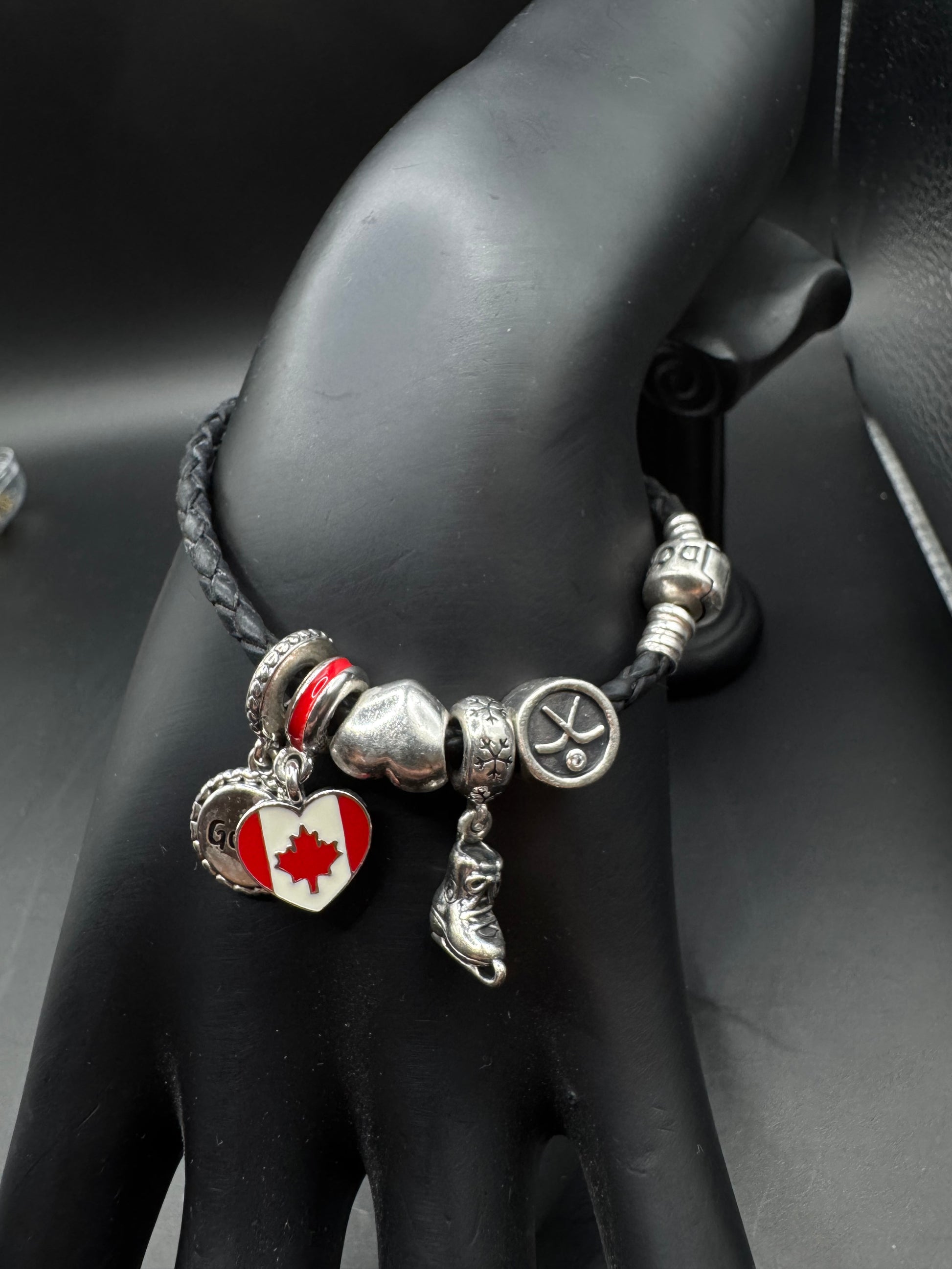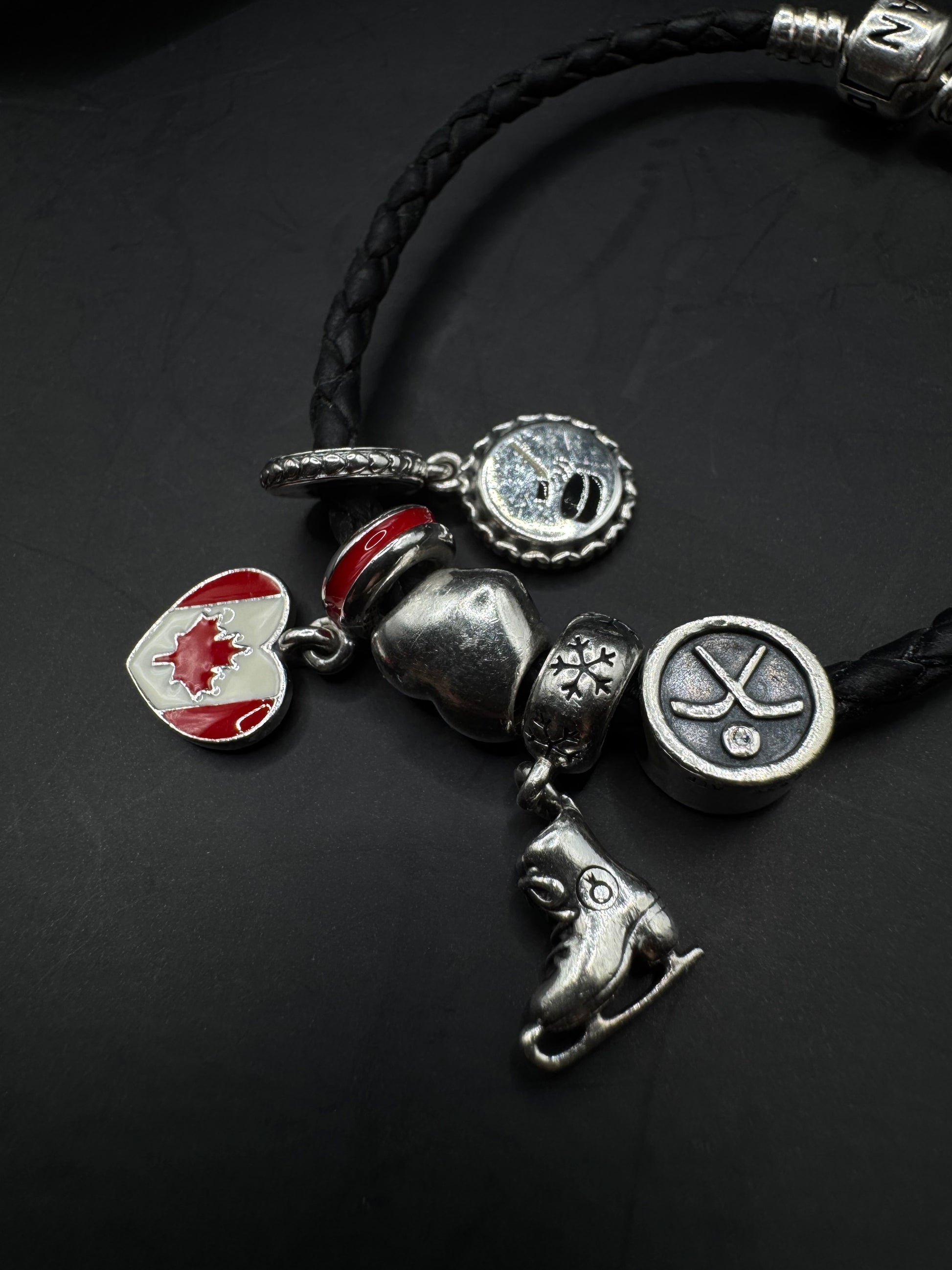 This authentic Pandora charm bracelet comes pre-styled and ready to wear. A black braided leather Pandora bracelet is finished with multiple sterling silver Pandora charms, including Canada- and hockey-inspired pieces plus a touch of red enamel for contrast.