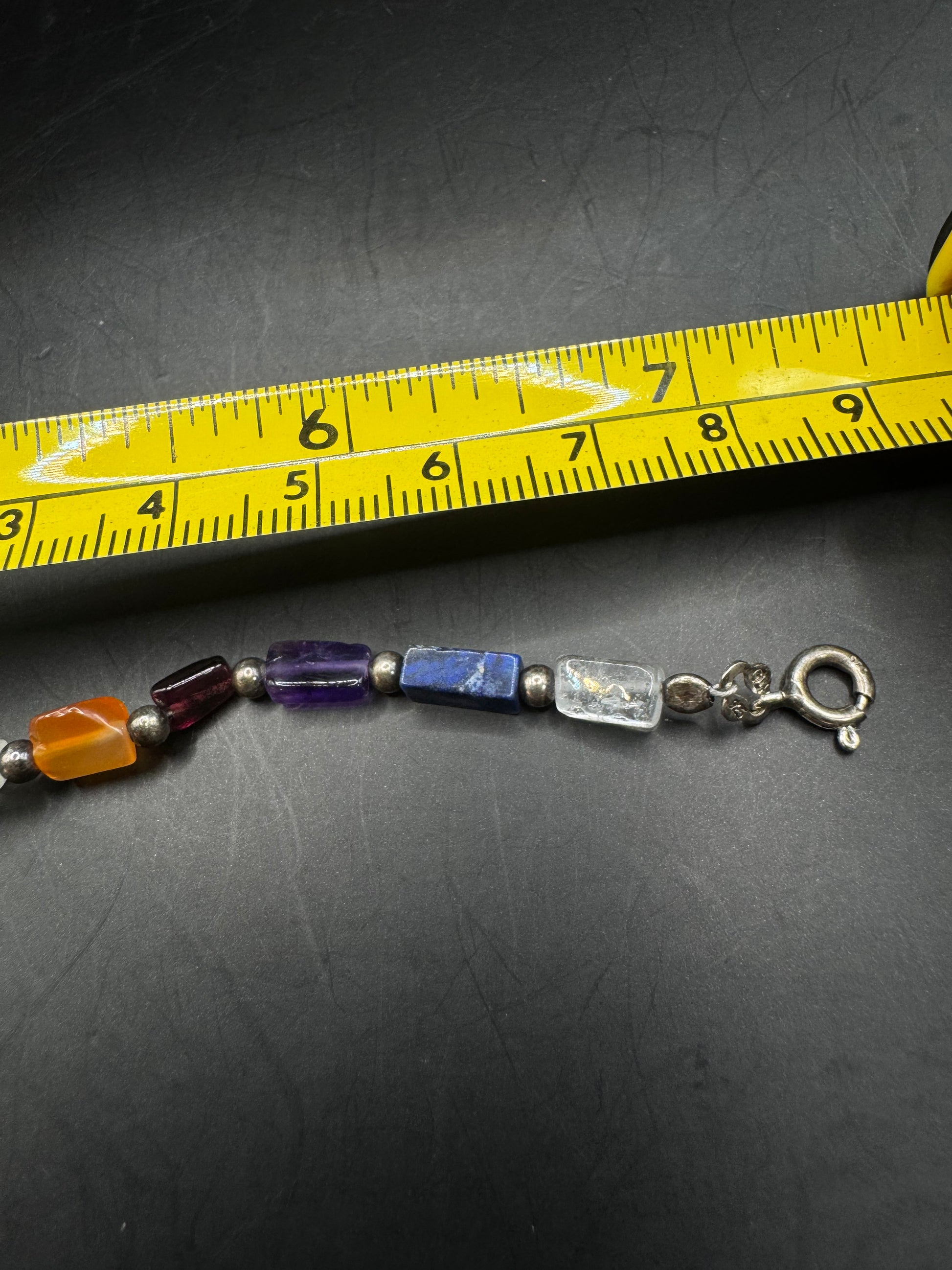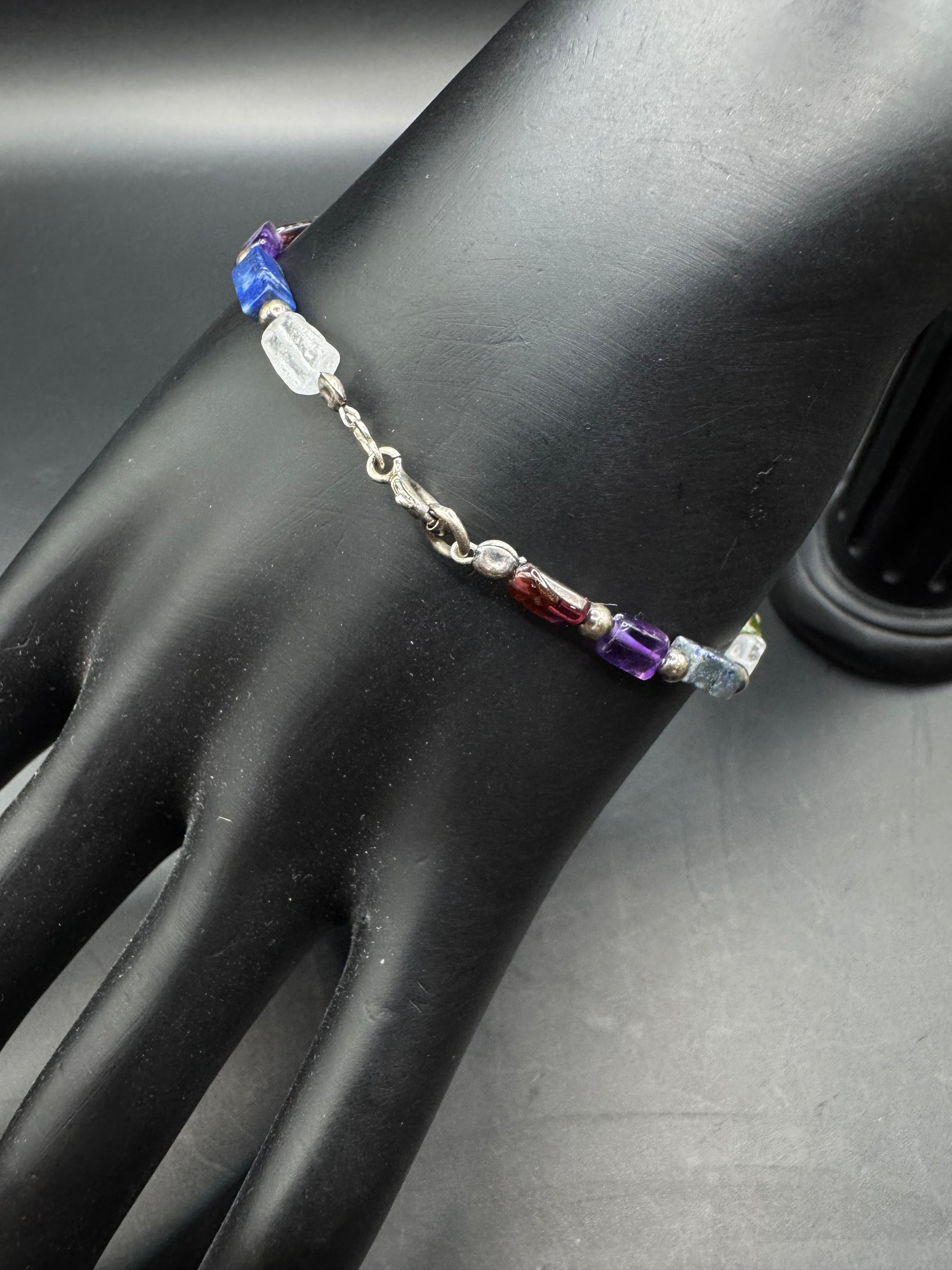 Brighten your accessory collection with this sterling silver beaded bracelet, featuring a vibrant mix of genuine gemstones and silver spacer beads. Measuring 7.5 inches in length, this bracelet combines colorful, rectangular-cut stones with classic sterling silver accents for a playful yet elegant look. Perfect for stacking or wearing solo, it adds a unique pop of color to any outfit.