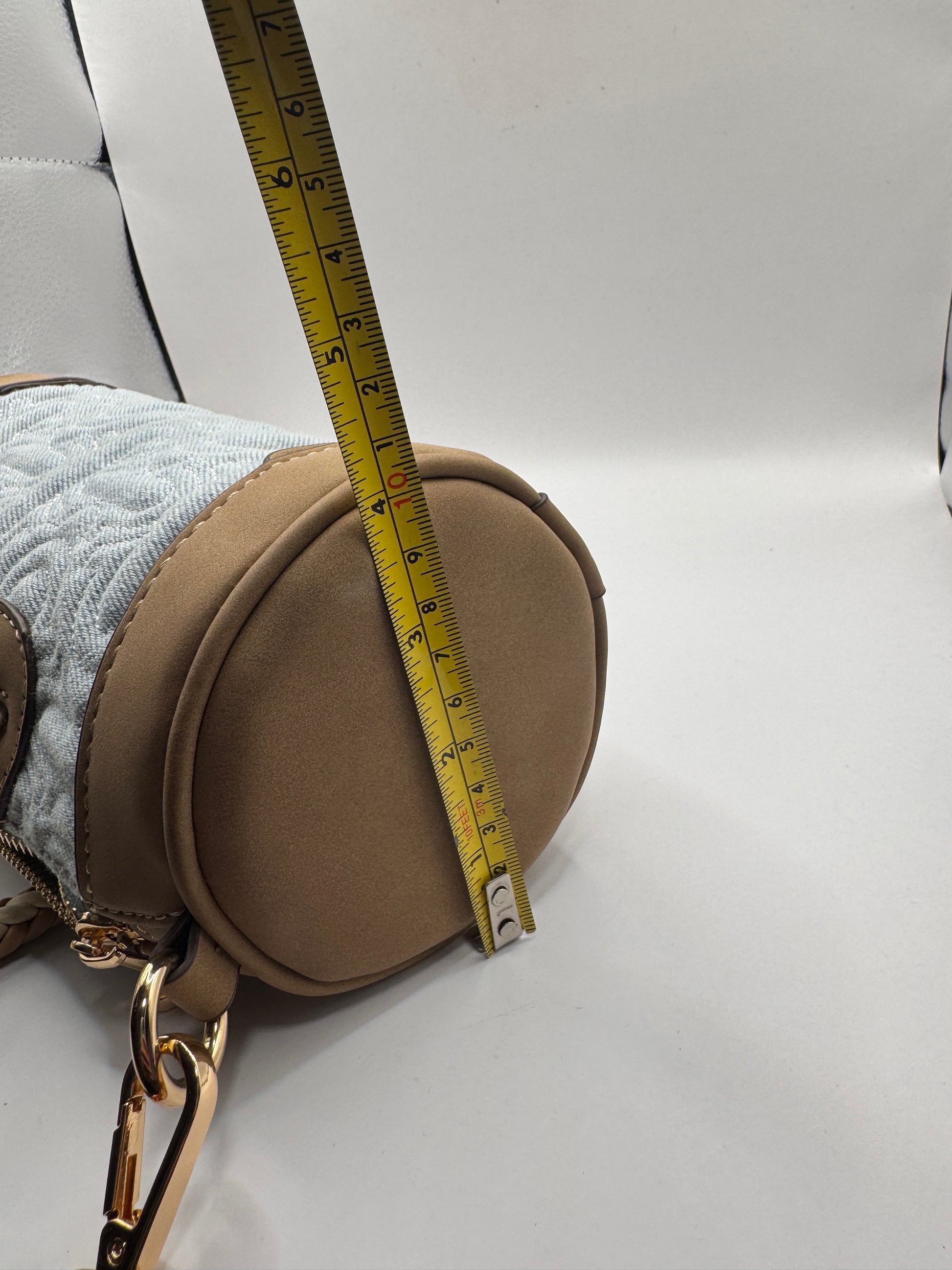 - Material: Quilted denim with tan leather trim