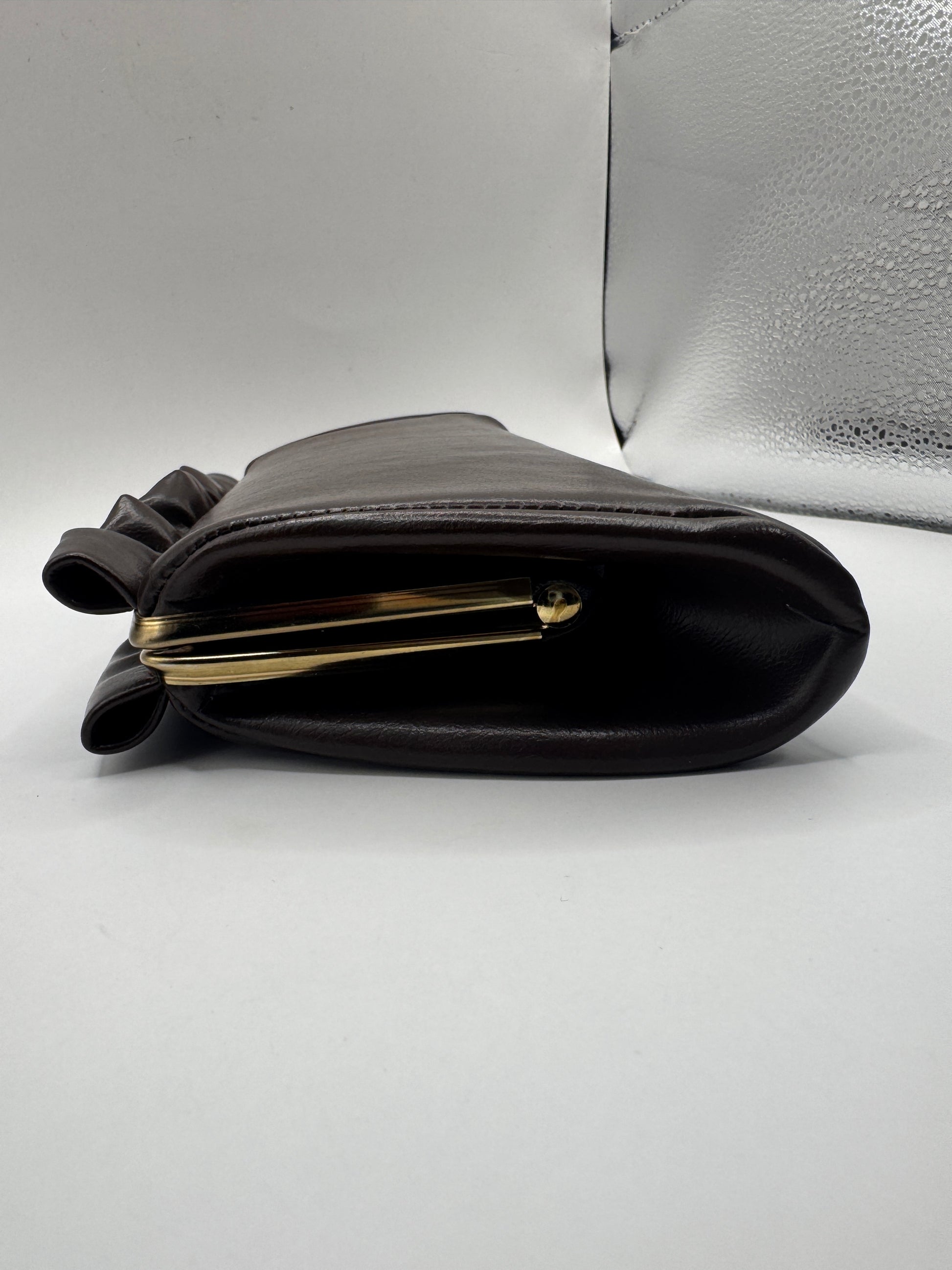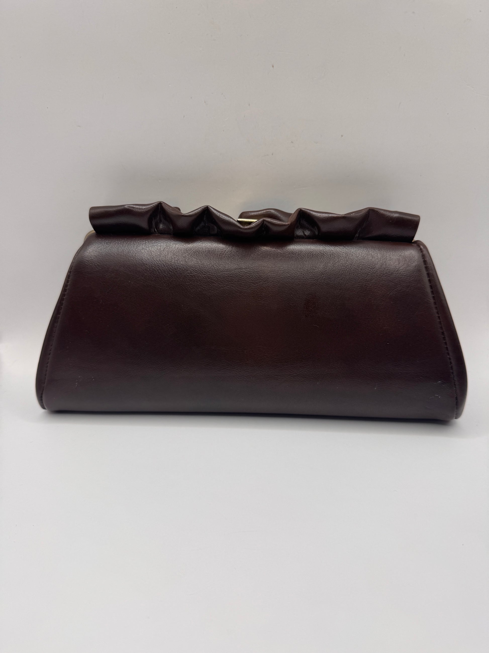 Elevate your accessory collection with this elegant mid-century clutch, dating to the 1940s. Crafted from supple brown leather, it features a soft ruffled top detail and a vintage gold-tone chain strap for versatile carrying. The compact silhouette is ideal for special occasions or adding a touch of retro sophistication to your look. Gently used and well-preserved, this clutch is a true statement piece for vintage lovers and collectors.