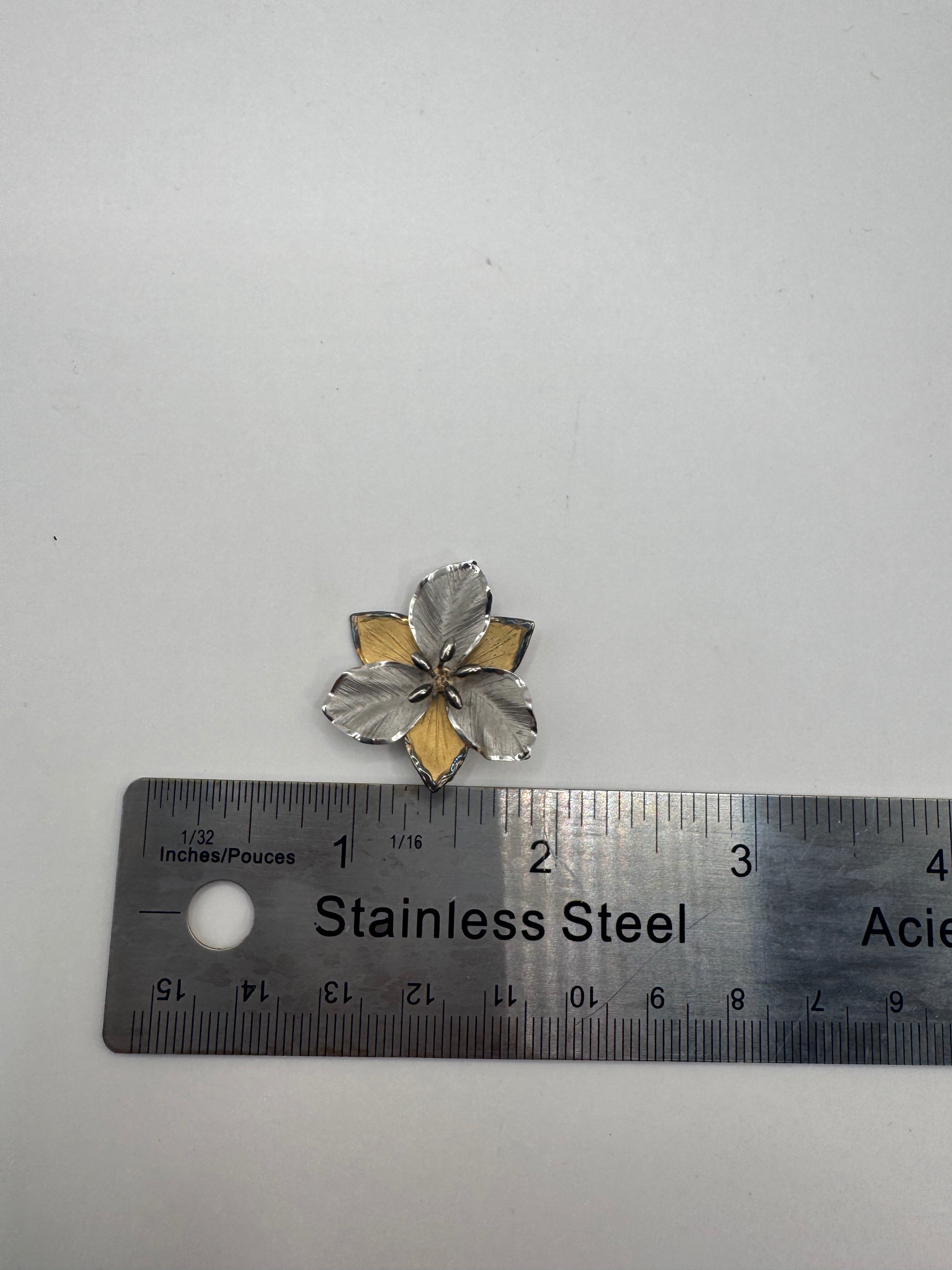 This vintage 1950s signet BOND BOYD brooch is a beautiful example of classic Canadian sterling jewelry. The dimensional flower design layers brushed sterling silver petals over a warm gold plated base, creating a soft two-tone look that works with both silver and gold jewelry.