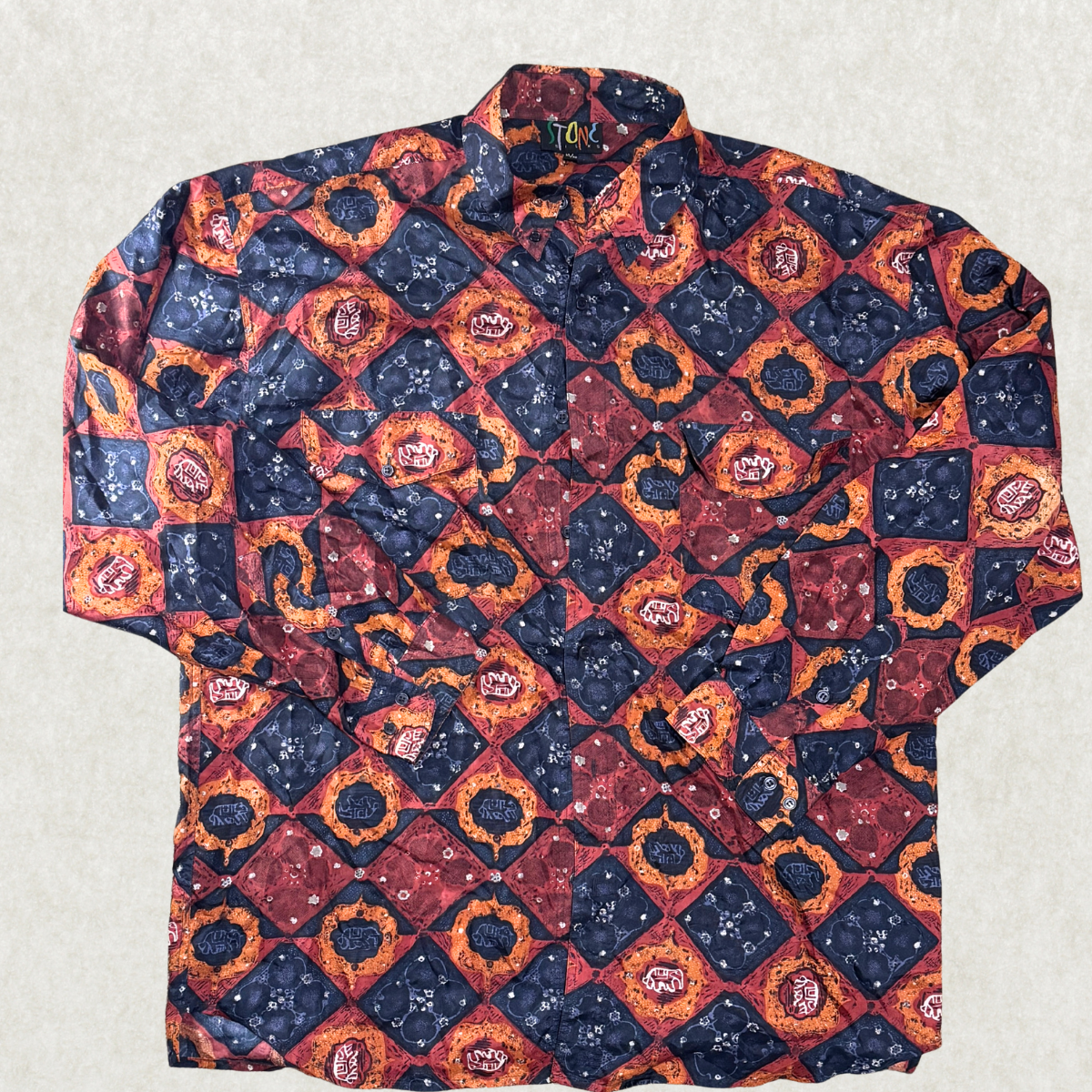 Step into retro style with this vintage 1970s STONE Silks men’s shirt, crafted from luxurious 100% silk. Featuring a bold geometric print in rich navy, burgundy, and gold tones, this oversized shirt offers a relaxed fit and standout pattern. With a length of 32”, width of 25”, and sleeve length of 25”, it’s perfect for those who appreciate unique vintage fashion and comfort. Size XL (oversized)—great for layering or making a statement on its own.
