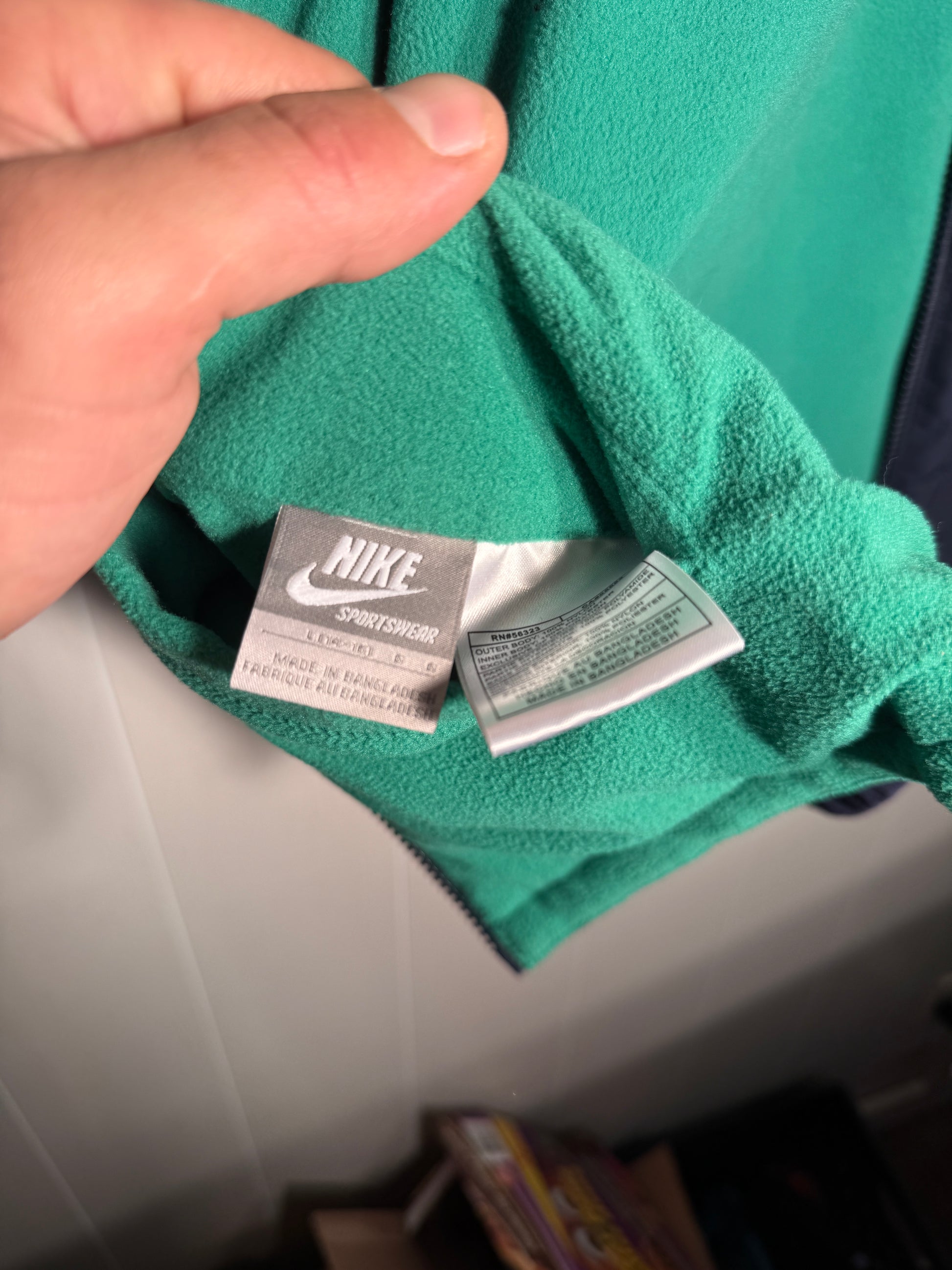Stay stylish and versatile with this vintage 1990s reversible Nike women’s jacket, featuring two functional looks in one classic piece. One side offers a blue waterproof shell perfect for wind and light rain, while the reverse side showcases a cozy green fleece ideal for cooler days. Designed in size L, it provides a comfortable fit with a 25.5-inch length, 21.5-inch width, and 24-inch sleeve length. A true retro Nike gem—great for collectors, outdoor wear, or anyone who loves authentic 90s sportswear.