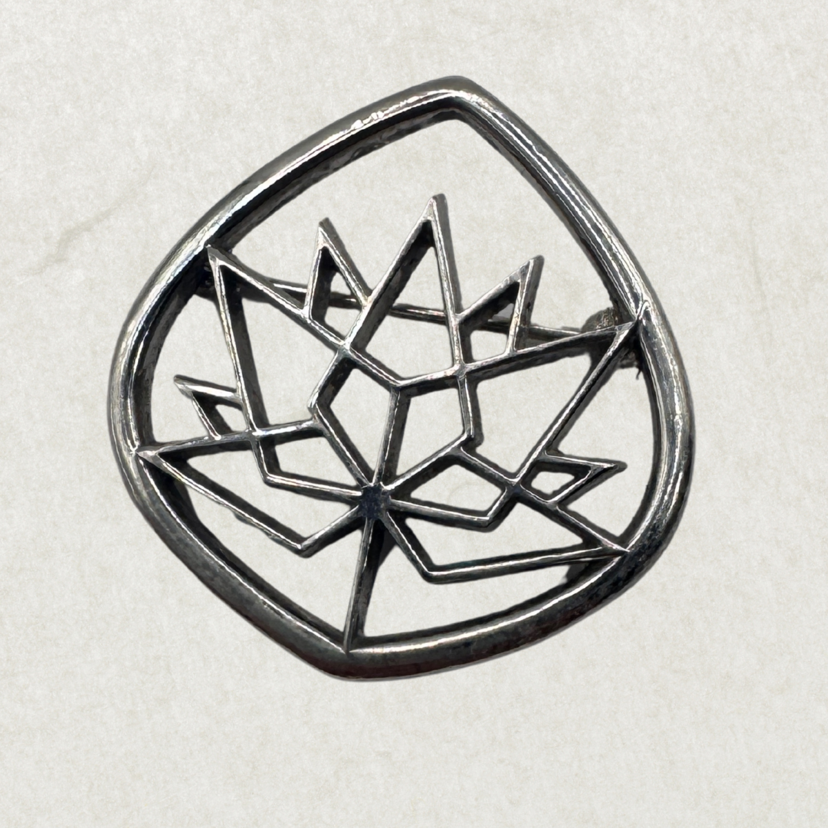 This vintage Birks 925 sterling silver brooch gives the classic maple leaf a modern twist. The openwork geometric design creates a stylized leaf motif framed by a soft, rounded triangle shape, making it a sleek, minimalist piece that still feels distinctly Canadian.