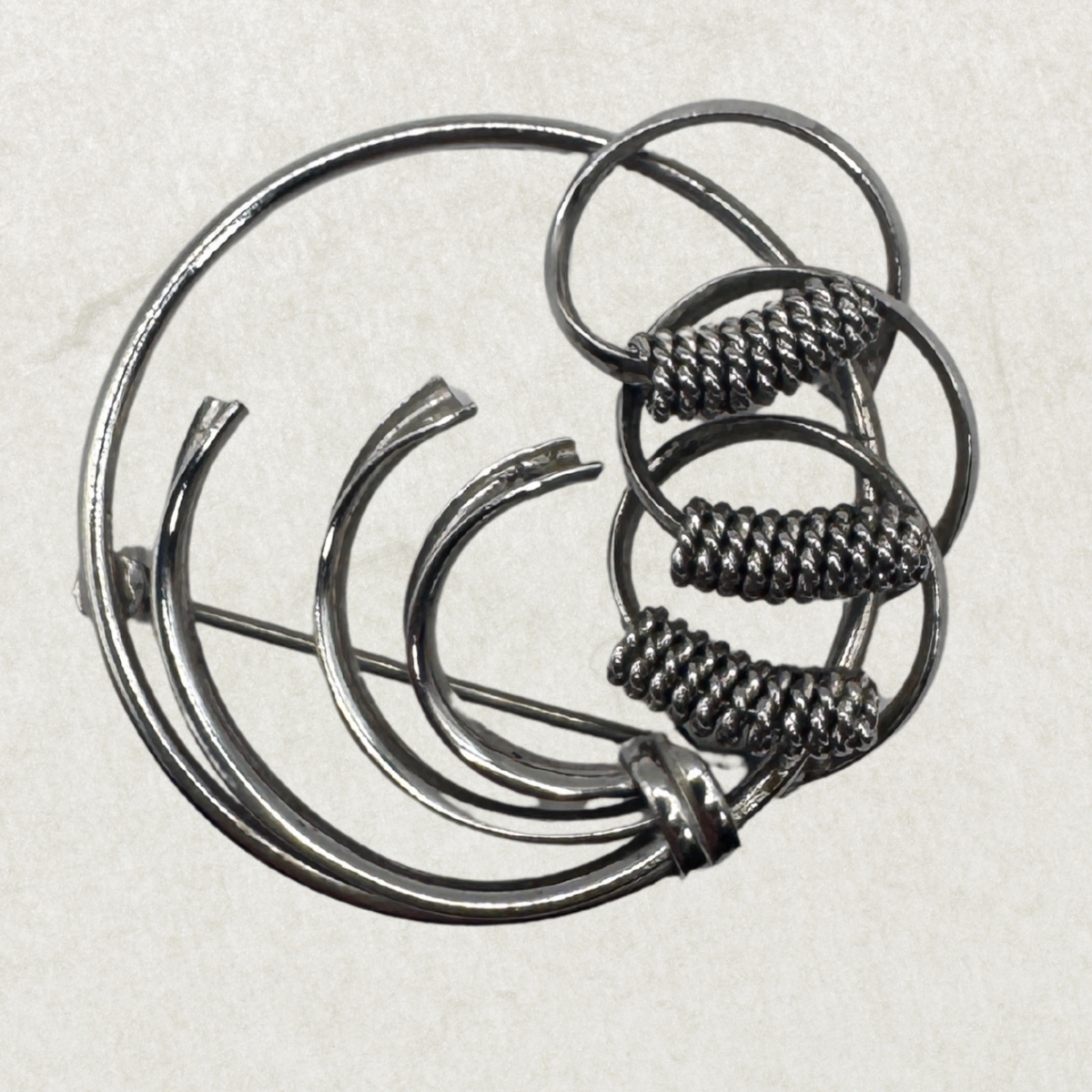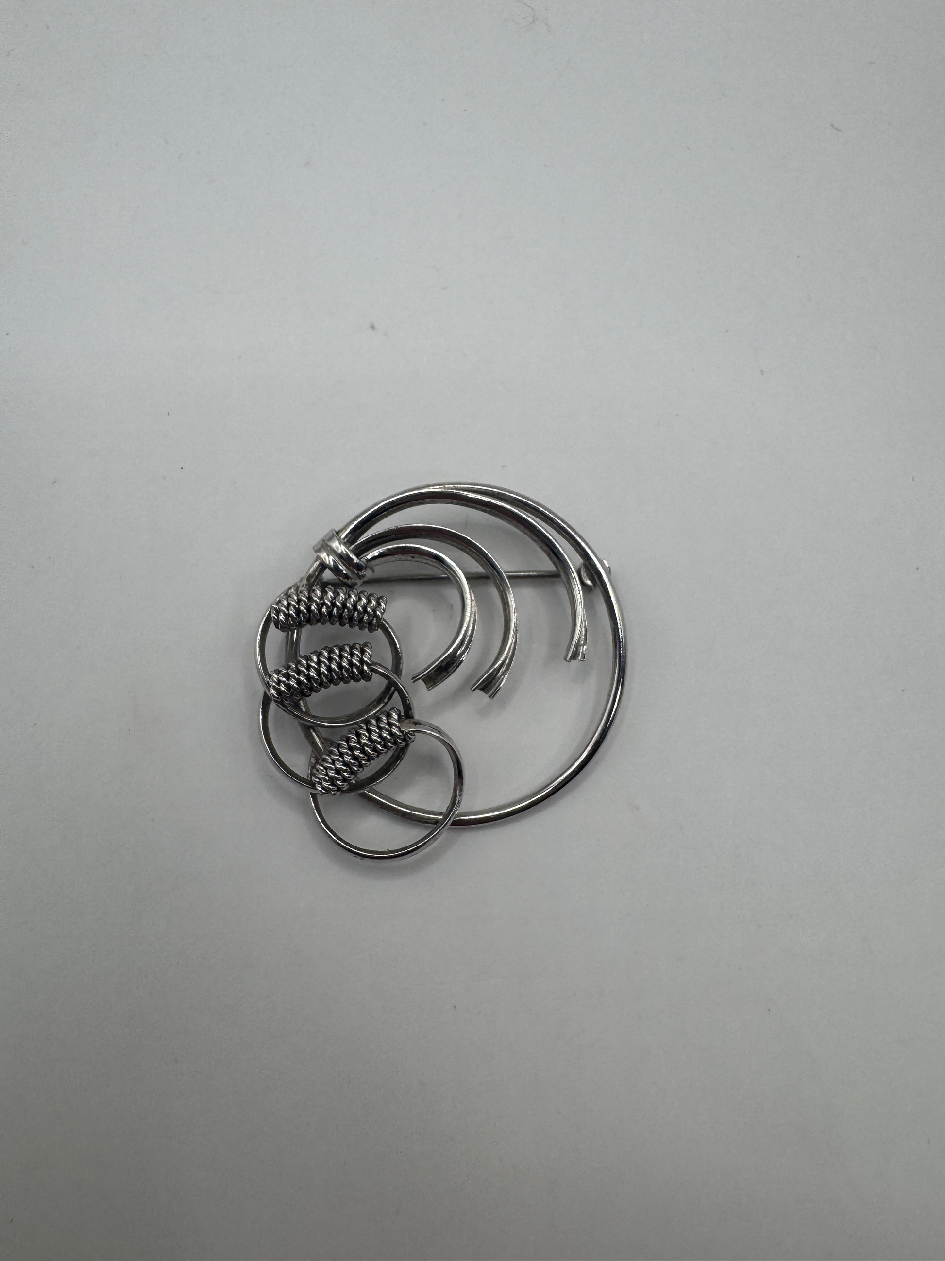 This vintage BOND BOYD sterling silver brooch is a striking modernist piece with a sculptural feel. Open circles and curved bands overlap to create an abstract design, finished with textured wrapped details on one side for extra depth and shine.