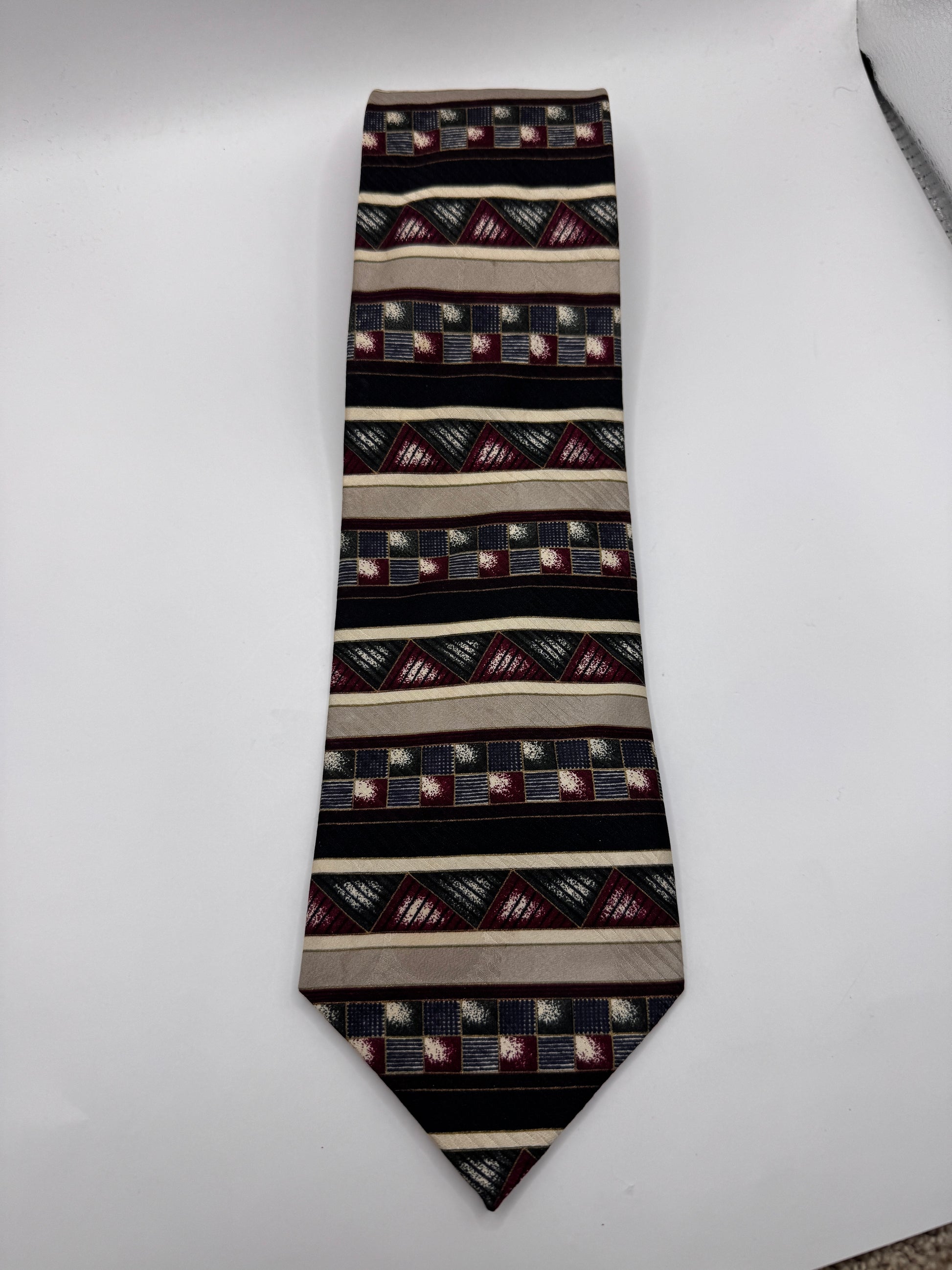 Add a bold vintage touch to your look with this Bosa tie, crafted from 100% silk with a graphic geometric stripe design. The mix of navy, burgundy, beige, and textured pattern blocks gives it that classic statement-tie feel—perfect for office looks, formal events, or anyone building a standout vintage menswear rotation.