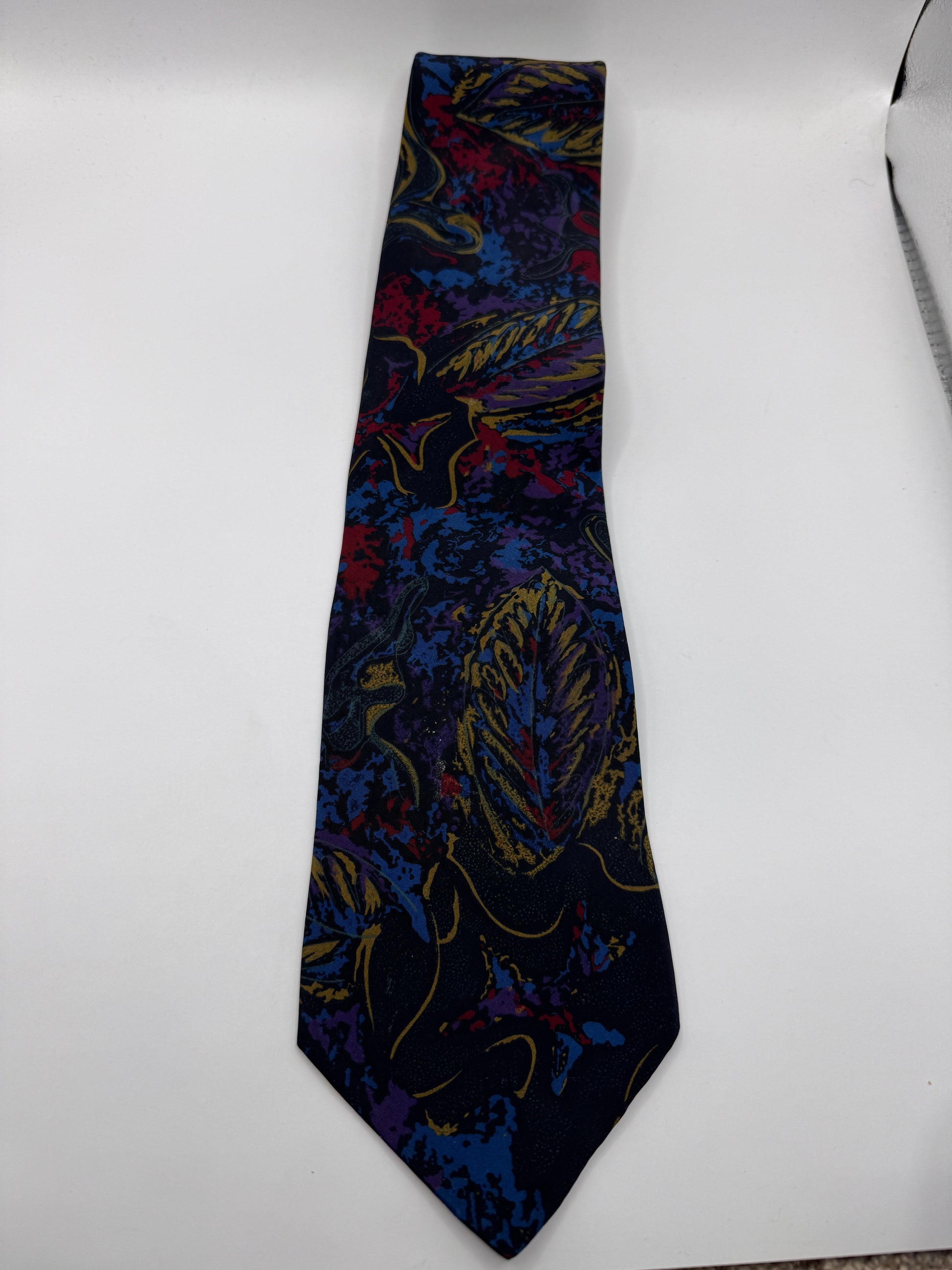 Bring bold vintage energy to your look with this Club International tie, made from 100% polyester with a vibrant abstract leaf pattern. The rich mix of navy, purple, blue, and red makes it a standout piece for collectors, retro menswear fans, or anyone who likes their accessories loud (in a good way).