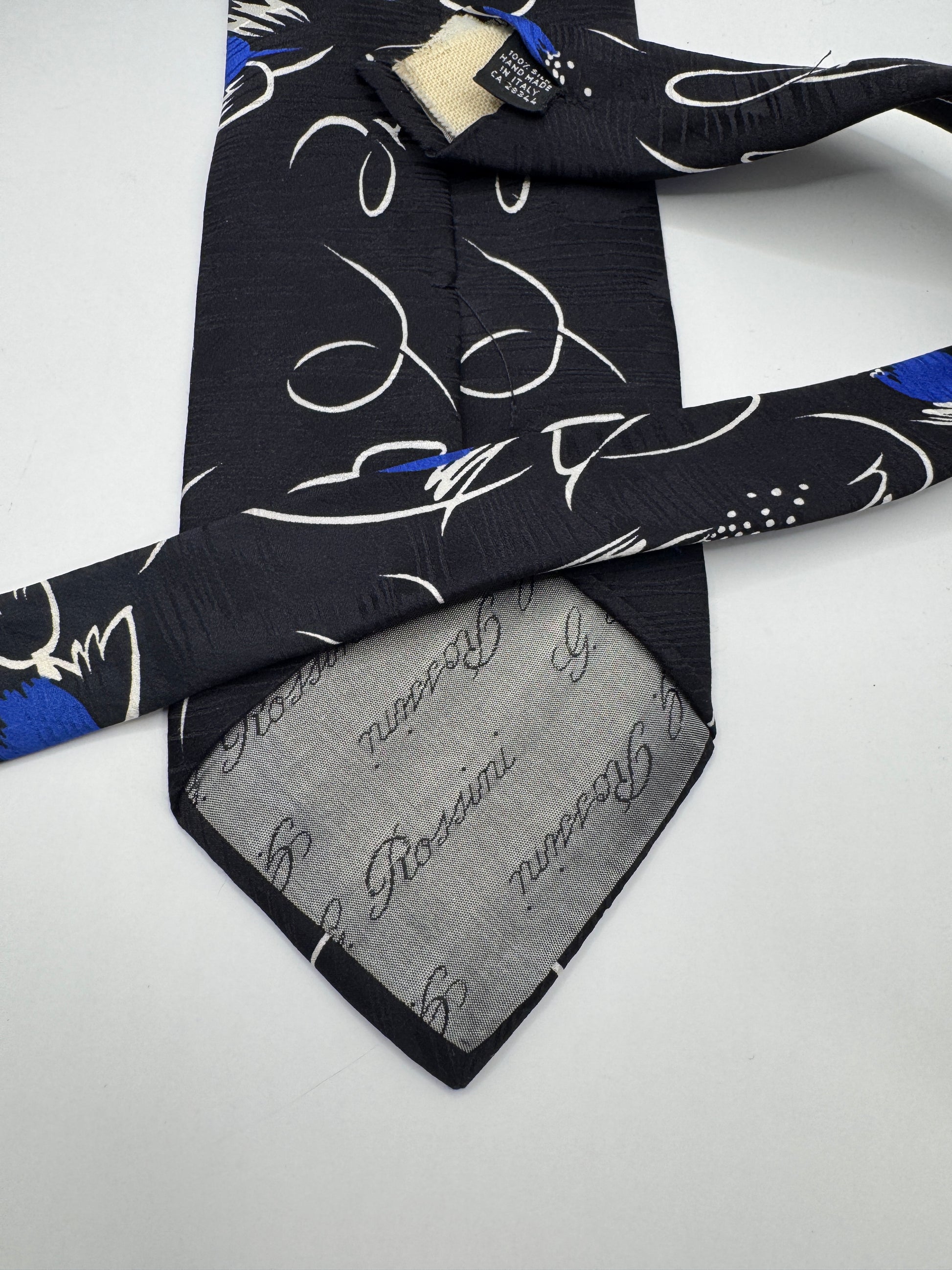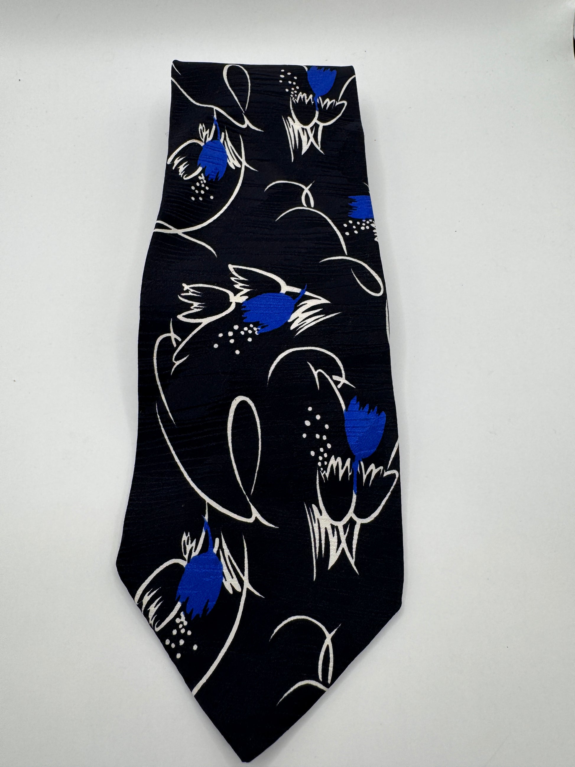 Add a bold artistic touch to your wardrobe with this Vintage Gino Rossini Tie, crafted in Italy from 100% silk. Featuring a striking abstract blue floral design on a deep navy background, this 56” x 3.5” tie is perfect for those who appreciate unique style and Italian craftsmanship. Soft, smooth, and lightweight, it’s ideal for both formal occasions and creative everyday looks.