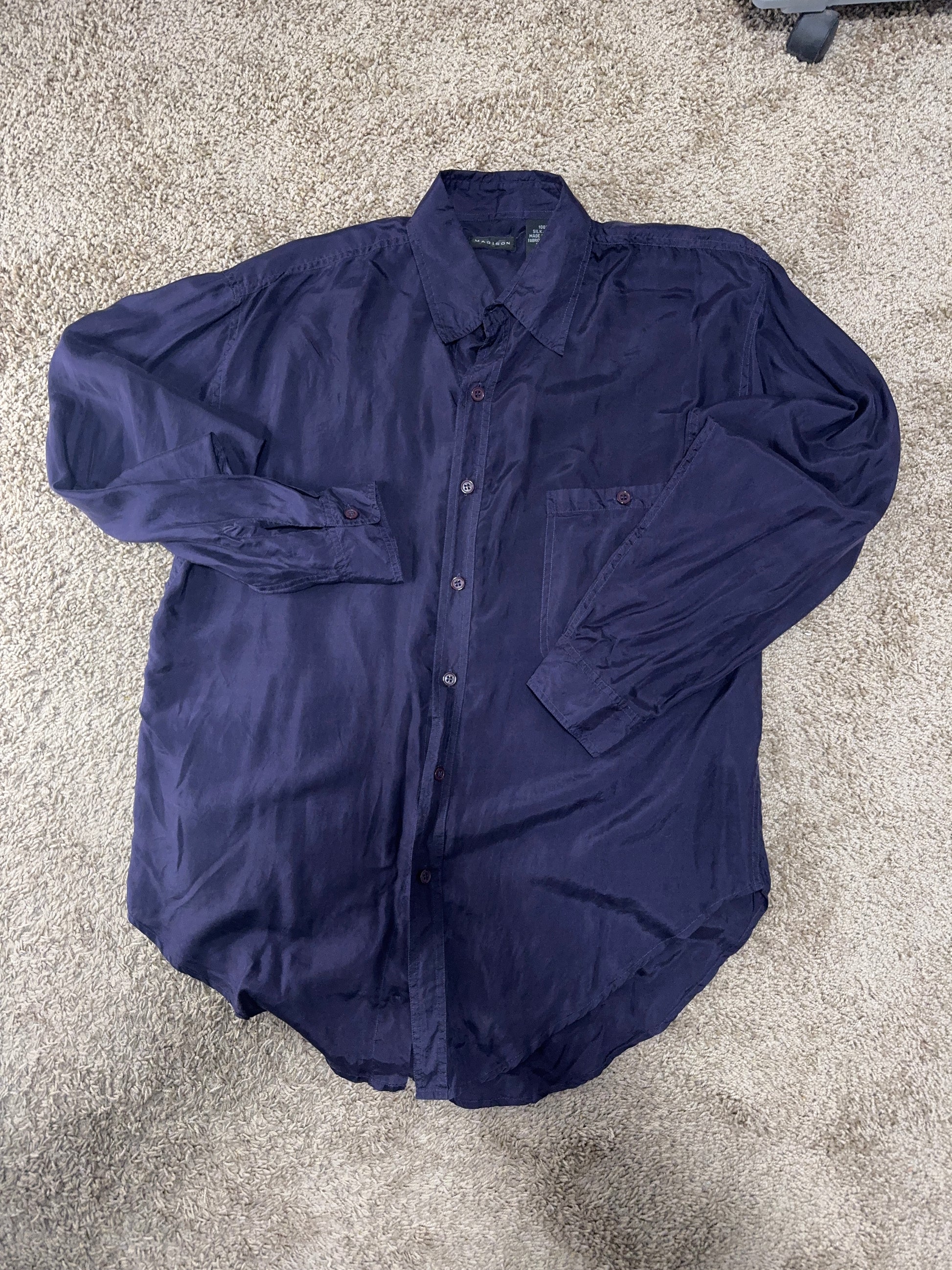 Step into classic style with this vintage Madison men’s shirt, crafted from luxurious 100% silk. Dating from the 1970s–80s, this long-sleeve button-down features a deep purple hue, single chest pocket, and a relaxed, drapey fit. With measurements of length 26–33”, width 22”, and sleeve 24”, it fits size M-L and offers timeless elegance and comfort. Perfect for collectors, vintage lovers, or anyone wanting a touch of retro luxury in their wardrobe.