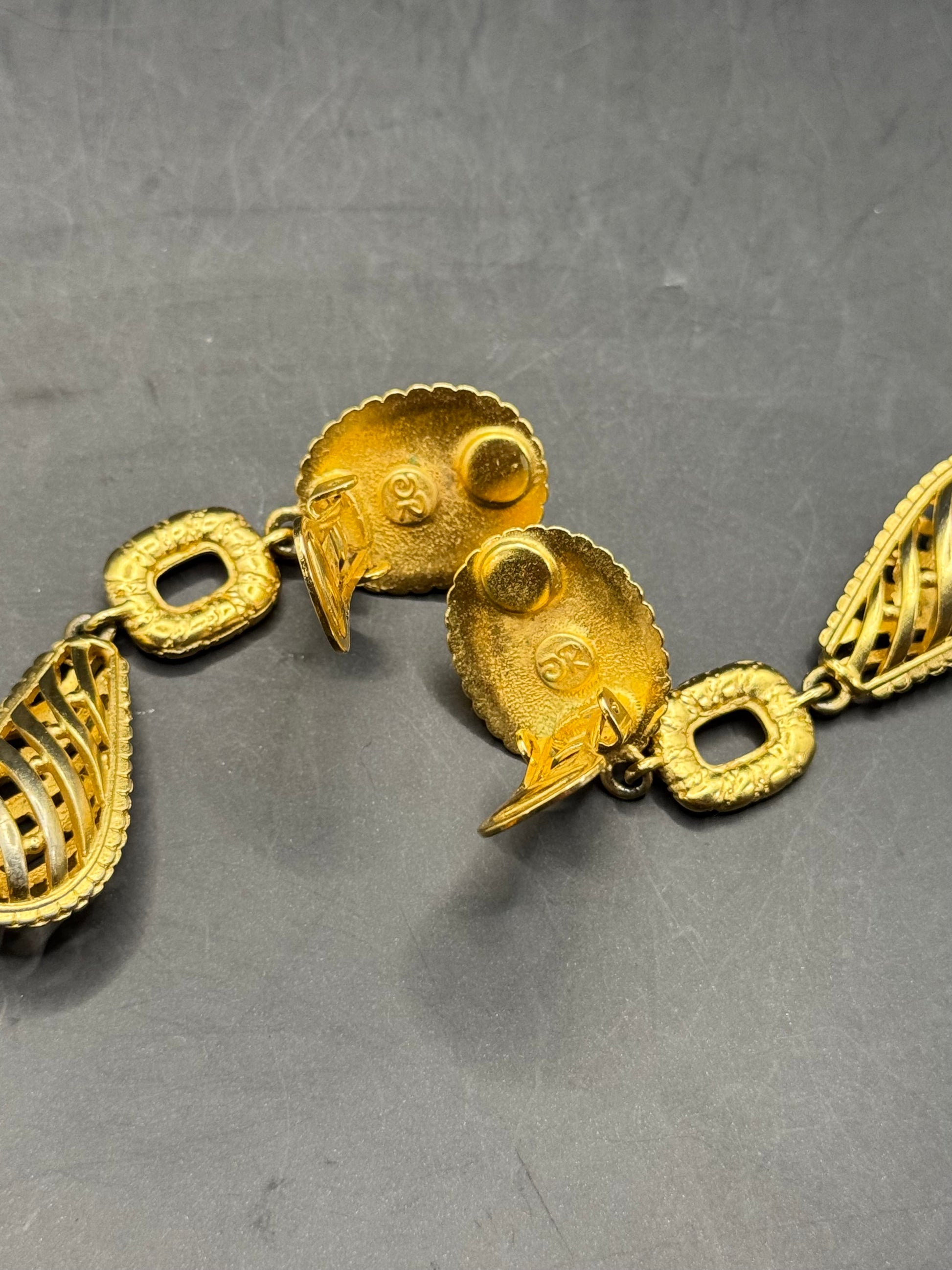 - Gold-tone metal with textured detailing
