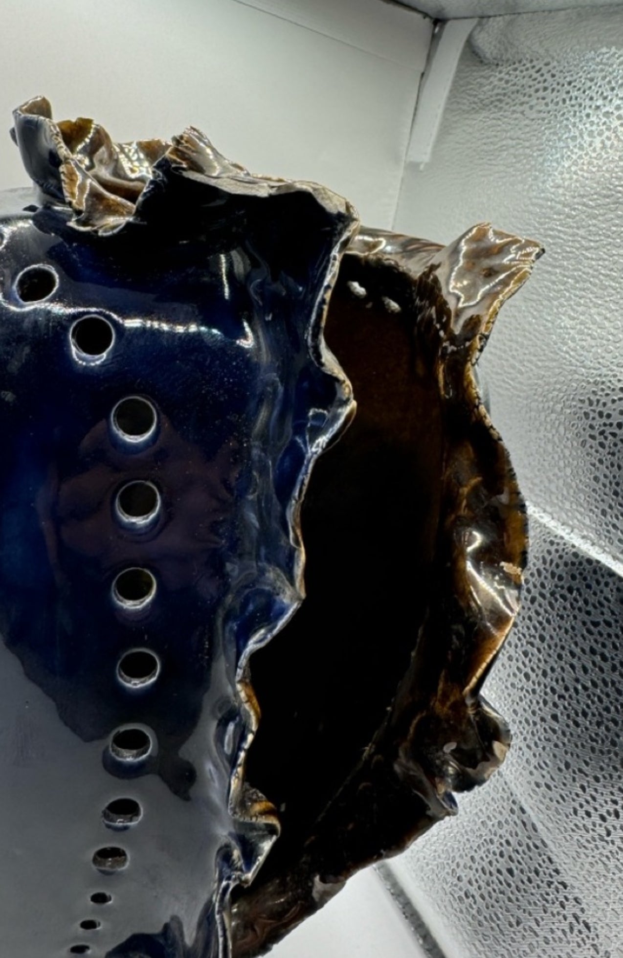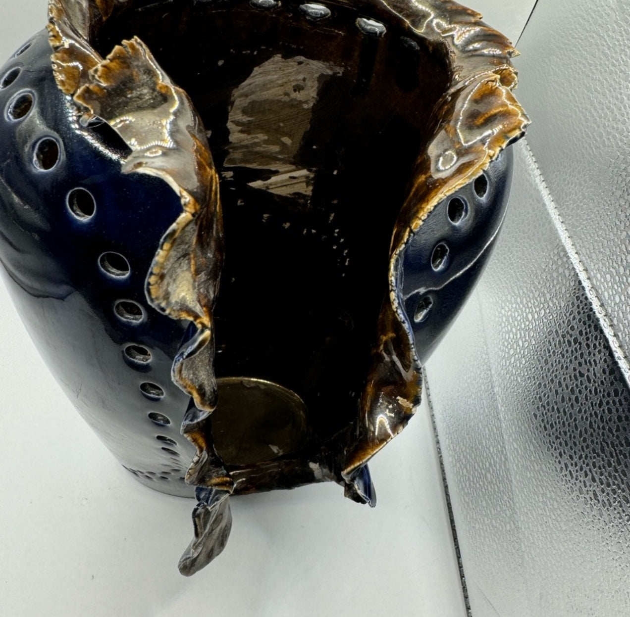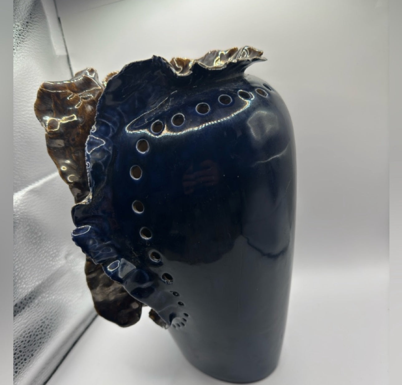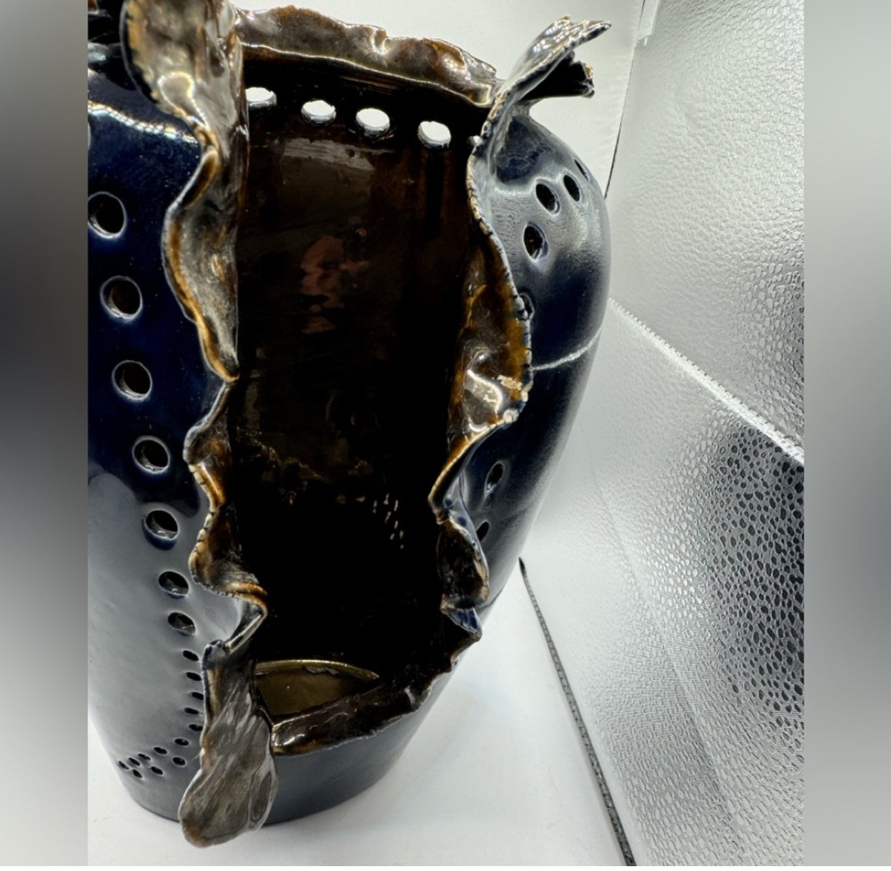 Showcase a true statement piece with this vintage porcelain vase, artist-signed “IS” and dating to around 1970. This sculptural vase features a dramatic navy blue glaze with an organic, openwork central cut and textured ruffled edges. Rows of circular perforations and a glossy finish highlight its bold, artistic character. The vase stands 11.5” tall and measures 7” wide by 7.5” deep, making it ideal as a standalone centerpiece or for displaying dried arrangements.