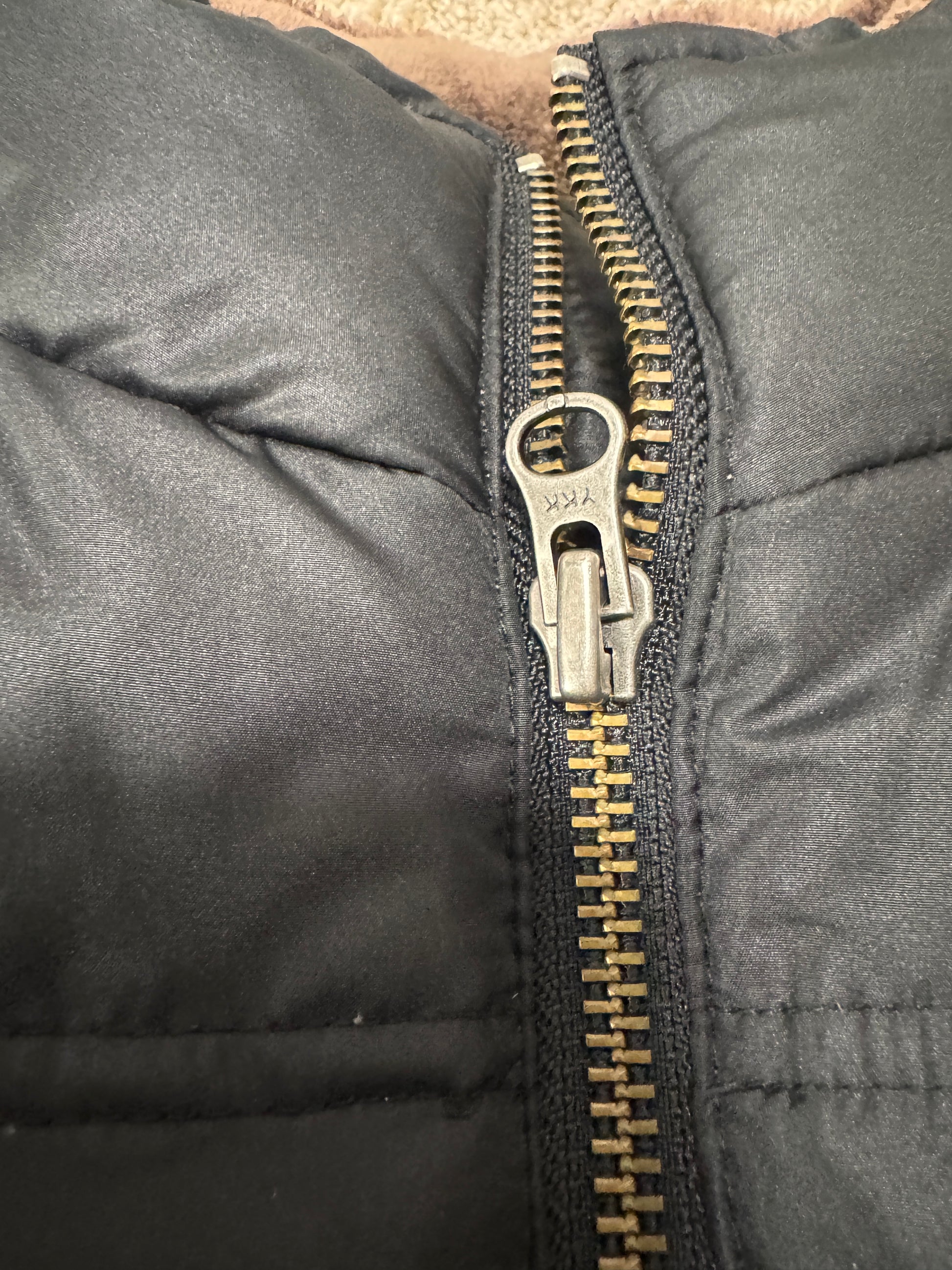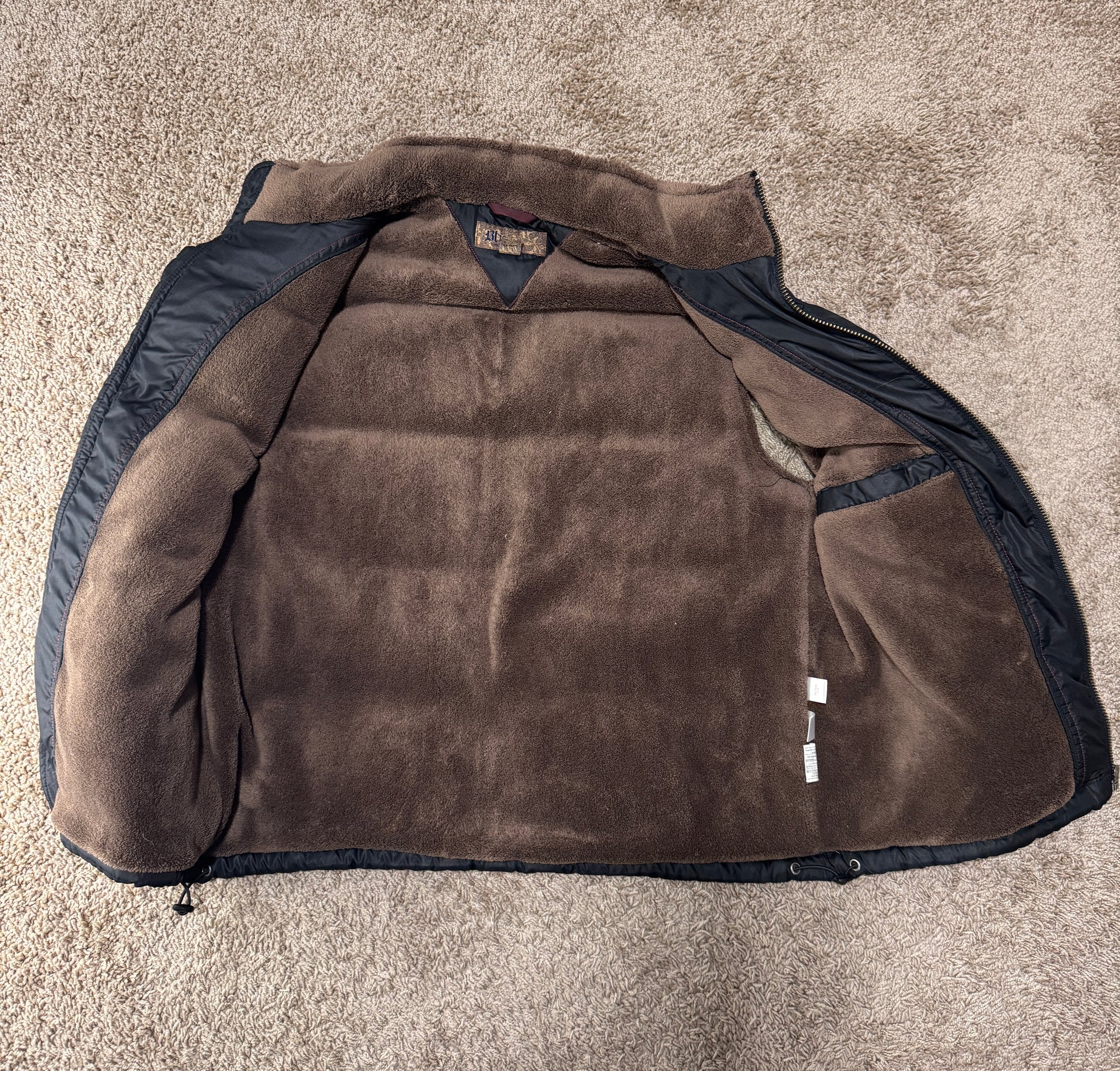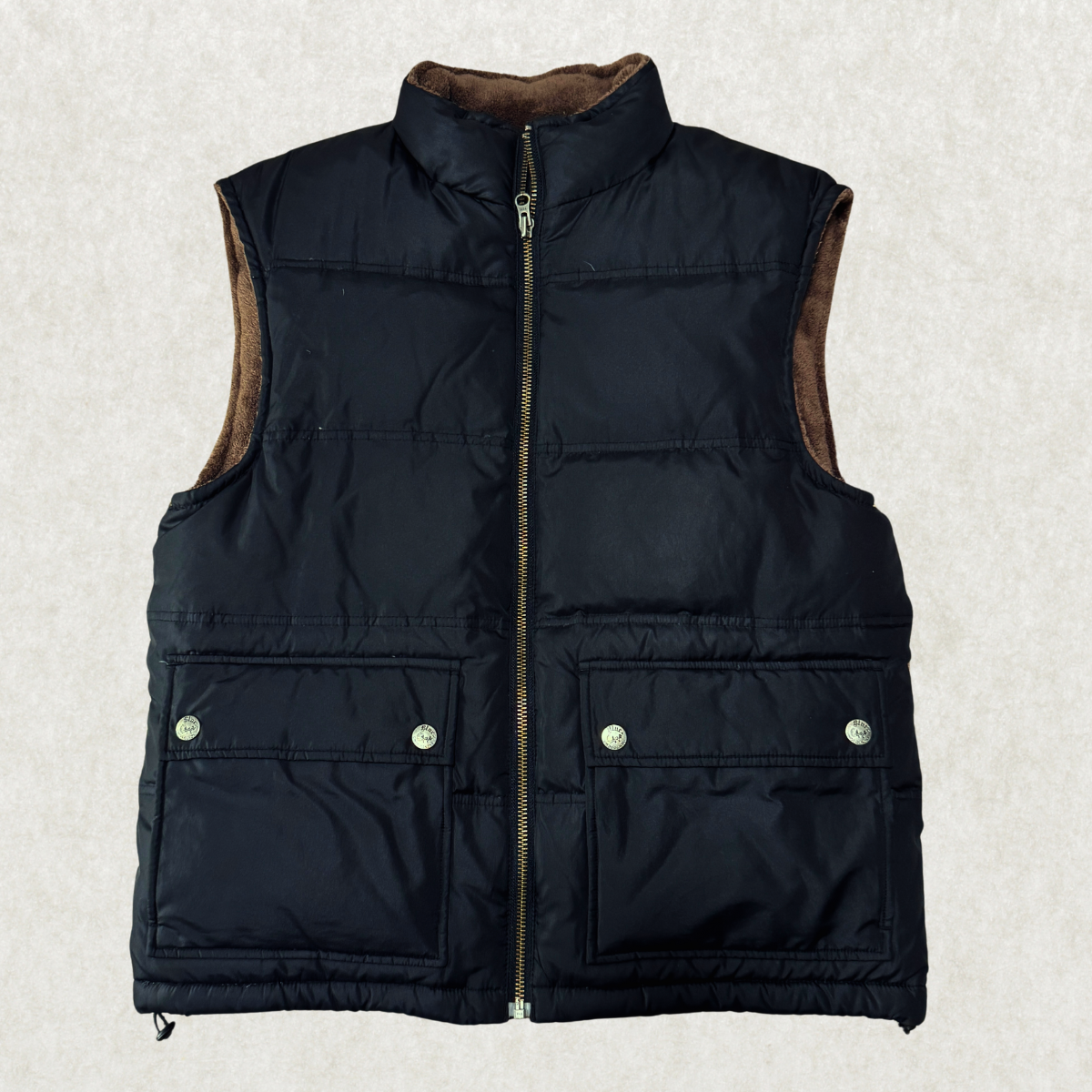 A solid vintage layering piece for cold-weather fits—this Pronto Uomo puffer vest brings warmth without the bulk. The navy quilted exterior is classic and easy to style, while the soft brown fleece lining adds extra coziness. Finished with a full zip front and roomy snap-flap pockets, it’s perfect over a hoodie, flannel, or sweater for everyday winter wear.