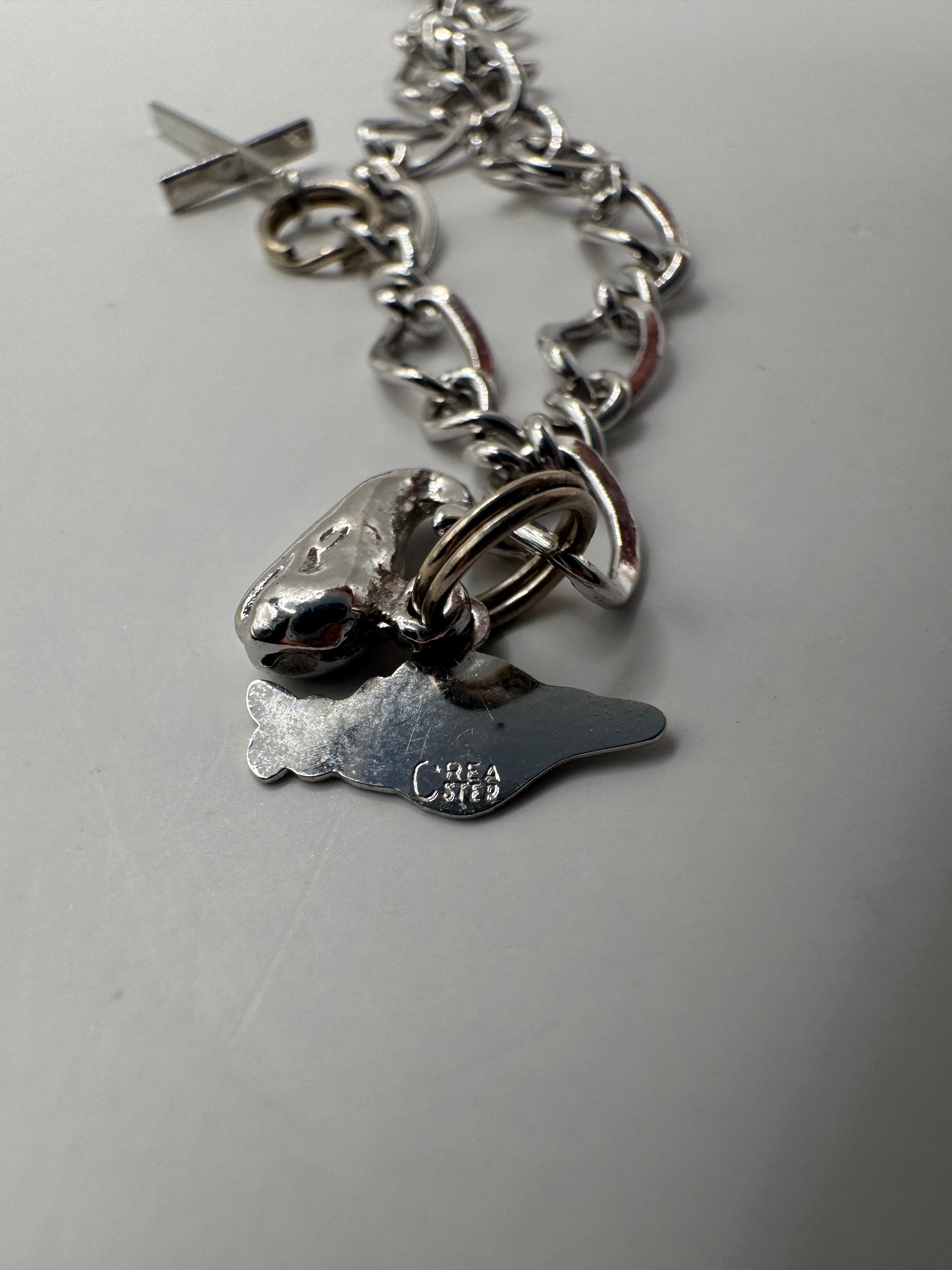 Celebrate nostalgia and personal style with this vintage sterling silver charm bracelet. Featuring a classic link chain adorned with a detailed ice skate, ballet slipper, and cross charm, this piece is perfect for collectors or anyone looking to add a meaningful accessory to their jewelry box. The sturdy construction and timeless design make it an ideal keepsake or thoughtful gift.
