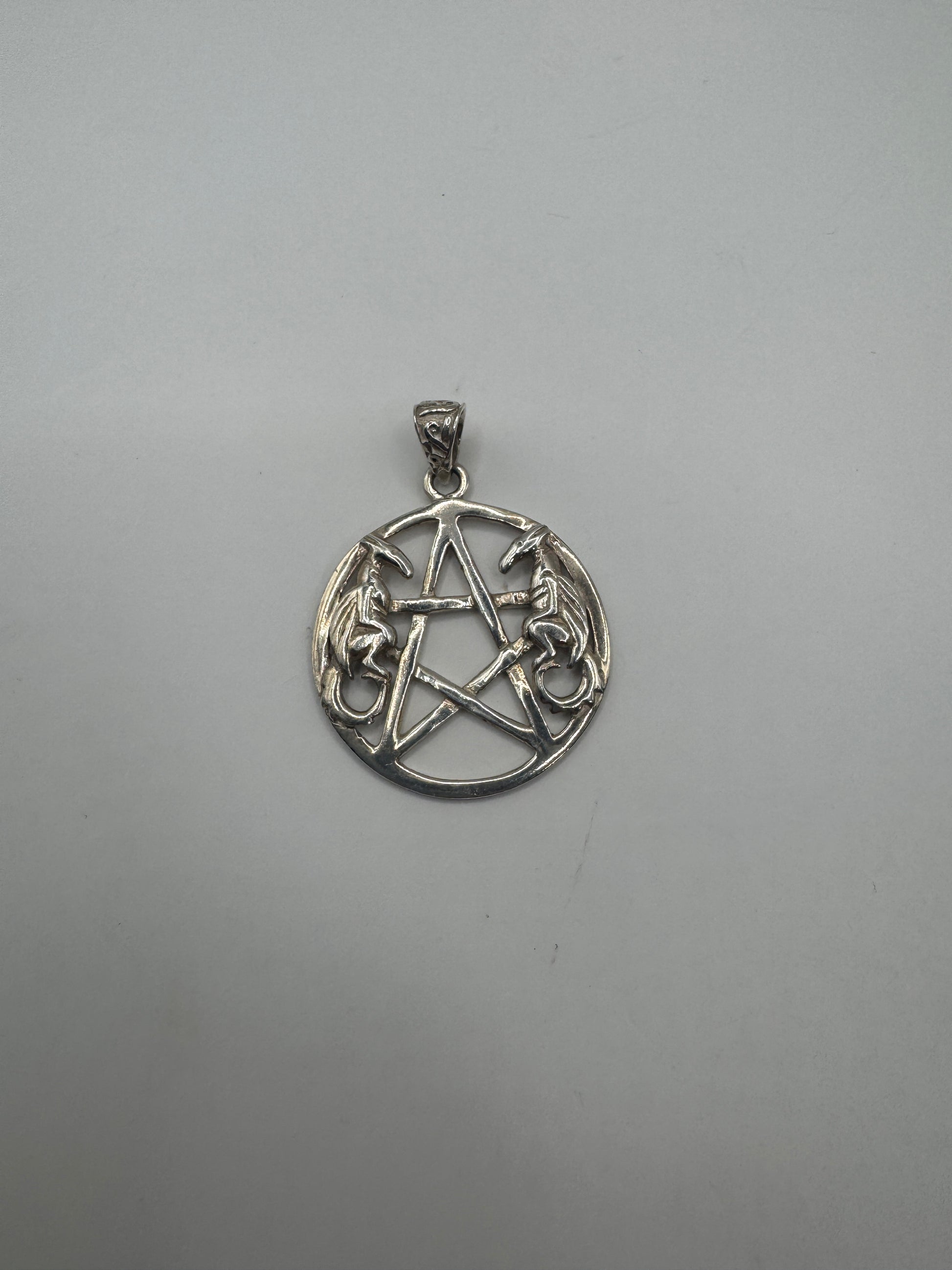 Vintage Sterling Silver Pendant – Large Pentagram with Dragons