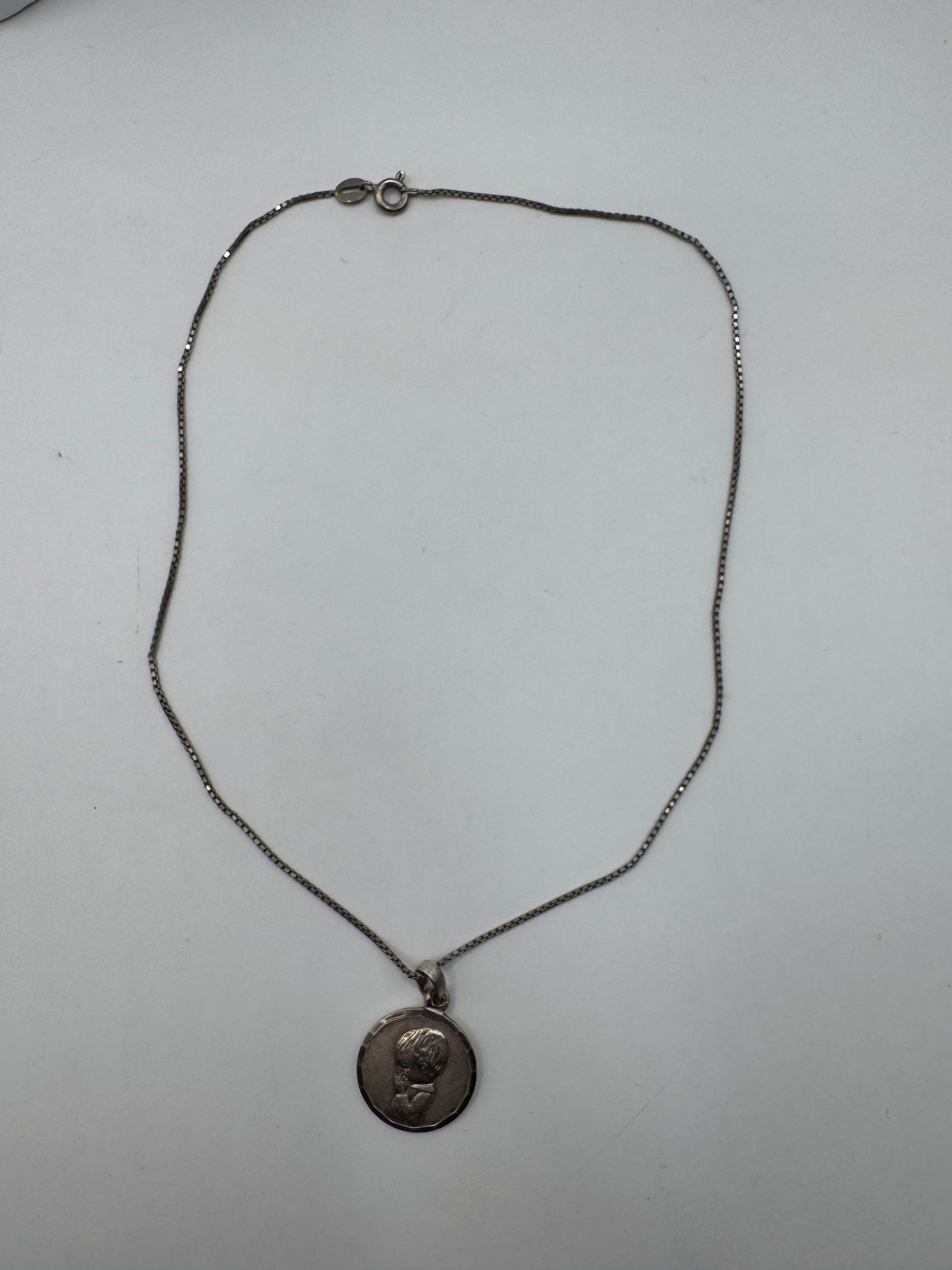 A delicate vintage sterling silver necklace with timeless charm. This piece features a slim 15” chain paired with an oval cameo-style medallion pendant, making it perfect for layering or wearing solo for a subtle vintage statement. Classic, minimal, and easy to dress up or down—an effortless everyday jewelry staple.