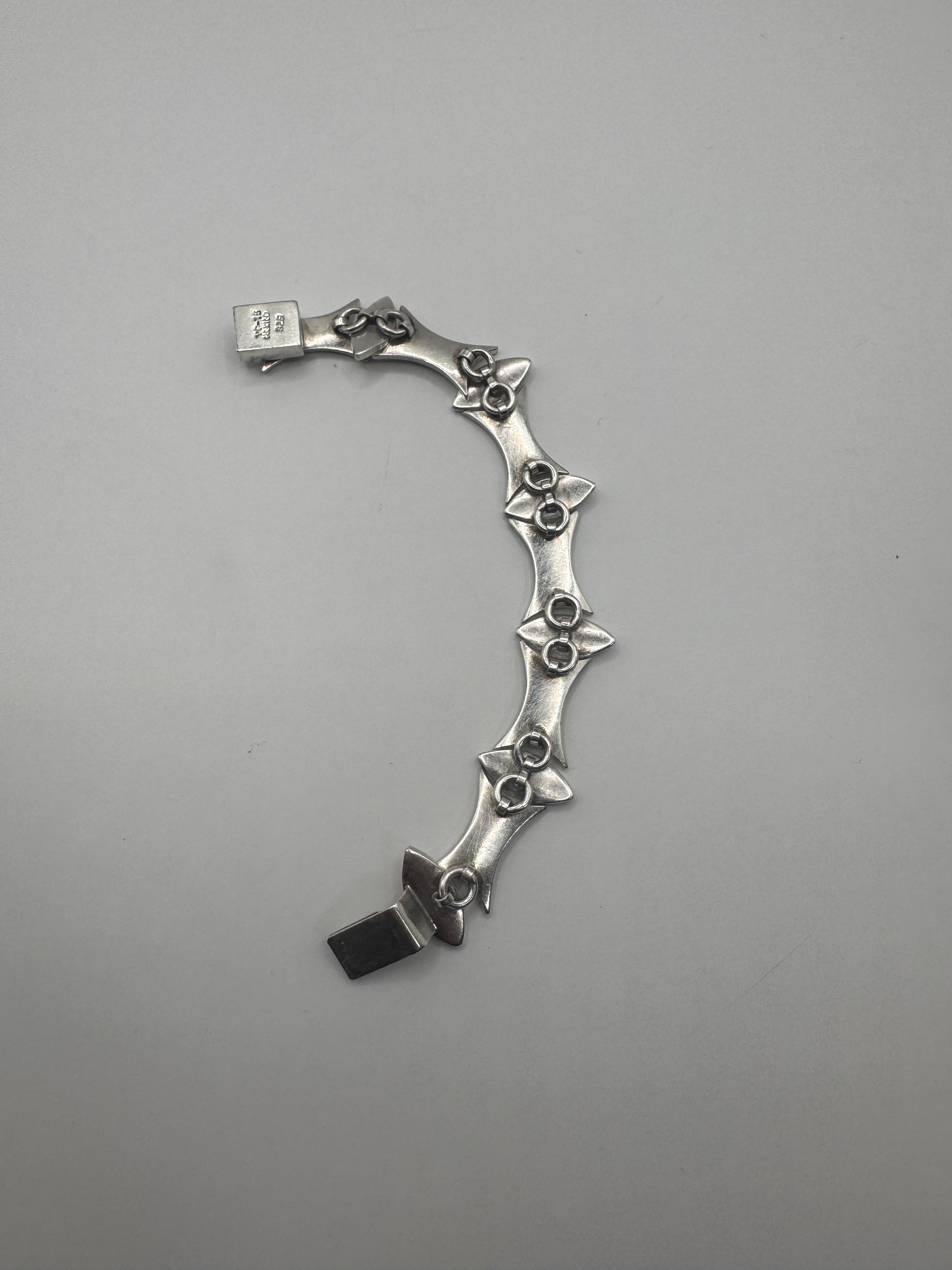 Discover a striking piece of wearable art with this vintage Taxco modernist sterling silver bracelet, crafted in the mid-1970s. Signed TF-15 Mexico 925, this genuine piece features bold, sculptural links in a timeless modernist design. Weighing 50.5 grams, the bracelet offers a substantial feel and showcases the renowned silversmithing tradition of Taxco, Mexico. A perfect addition for collectors or anyone who appreciates unique, handcrafted jewelry.