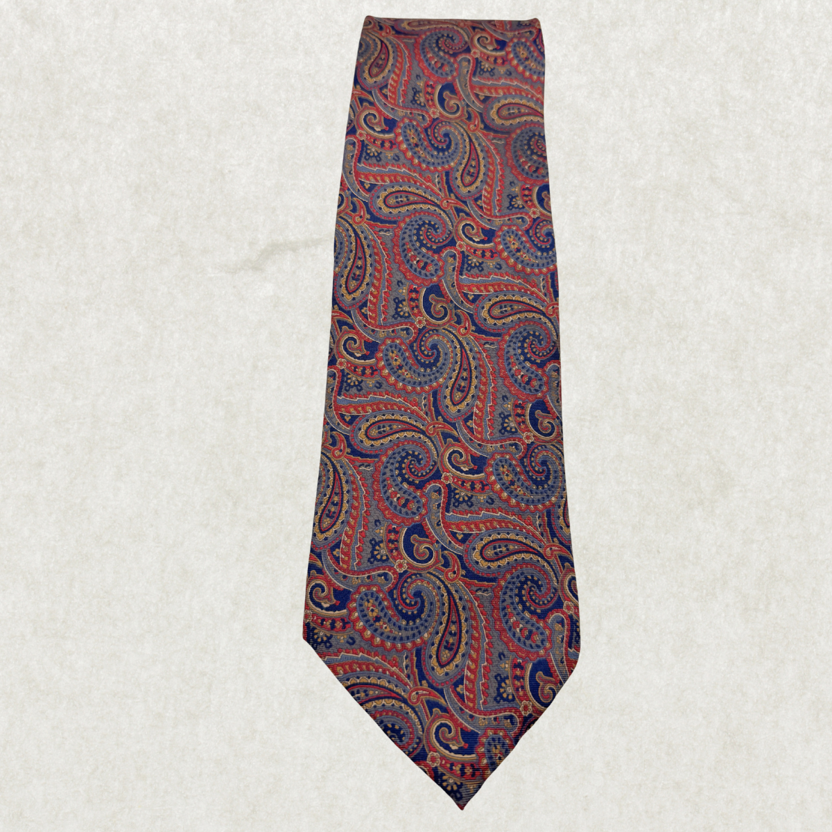 Add timeless polish to your look with this vintage The Windsor Collection tie, crafted from 100% silk in a rich paisley pattern. The warm red base with blue and gold-toned detailing gives it that classic “power tie” vibe—perfect for workwear, weddings, or anyone building a sharp vintage menswear rotation.