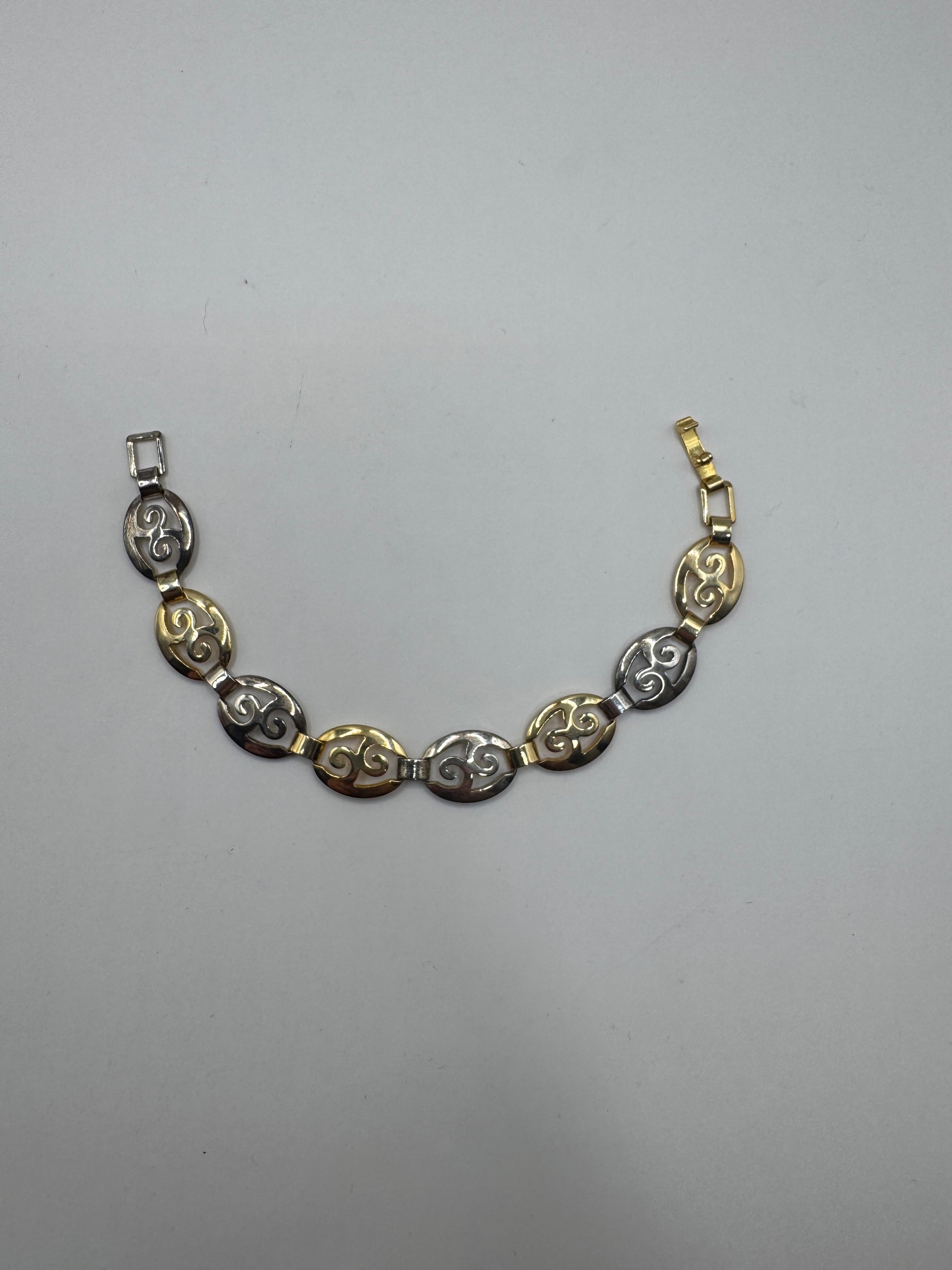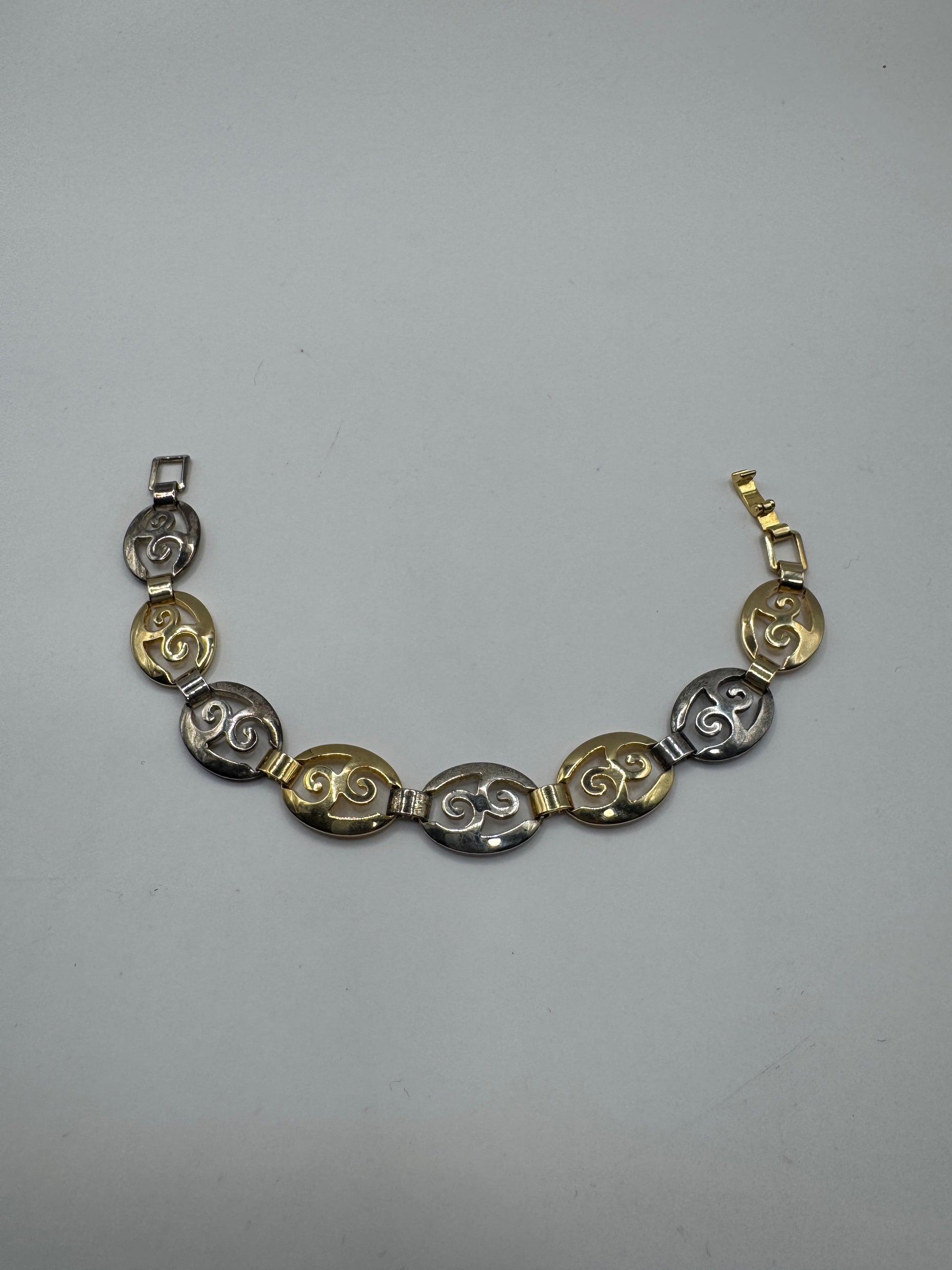 Add timeless elegance to your collection with this vintage two-tone sterling silver bracelet, featuring alternating silver and gold-tone oval links with intricate scroll cutout designs. The classic combination of silver and gold makes this piece versatile and perfect for stacking or wearing solo. A beautiful choice for collectors or anyone seeking vintage sophistication.